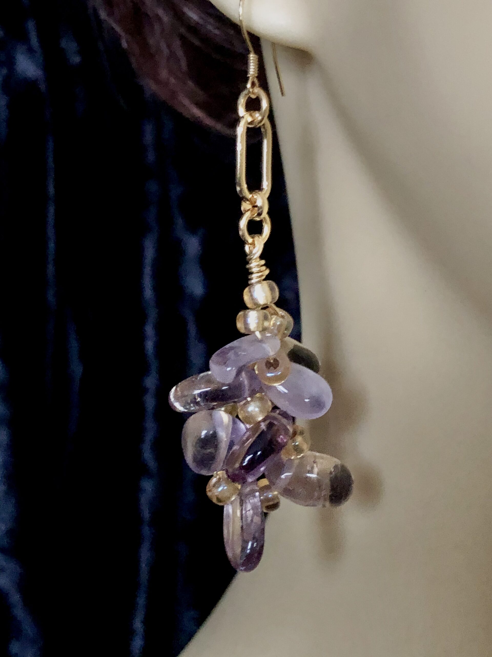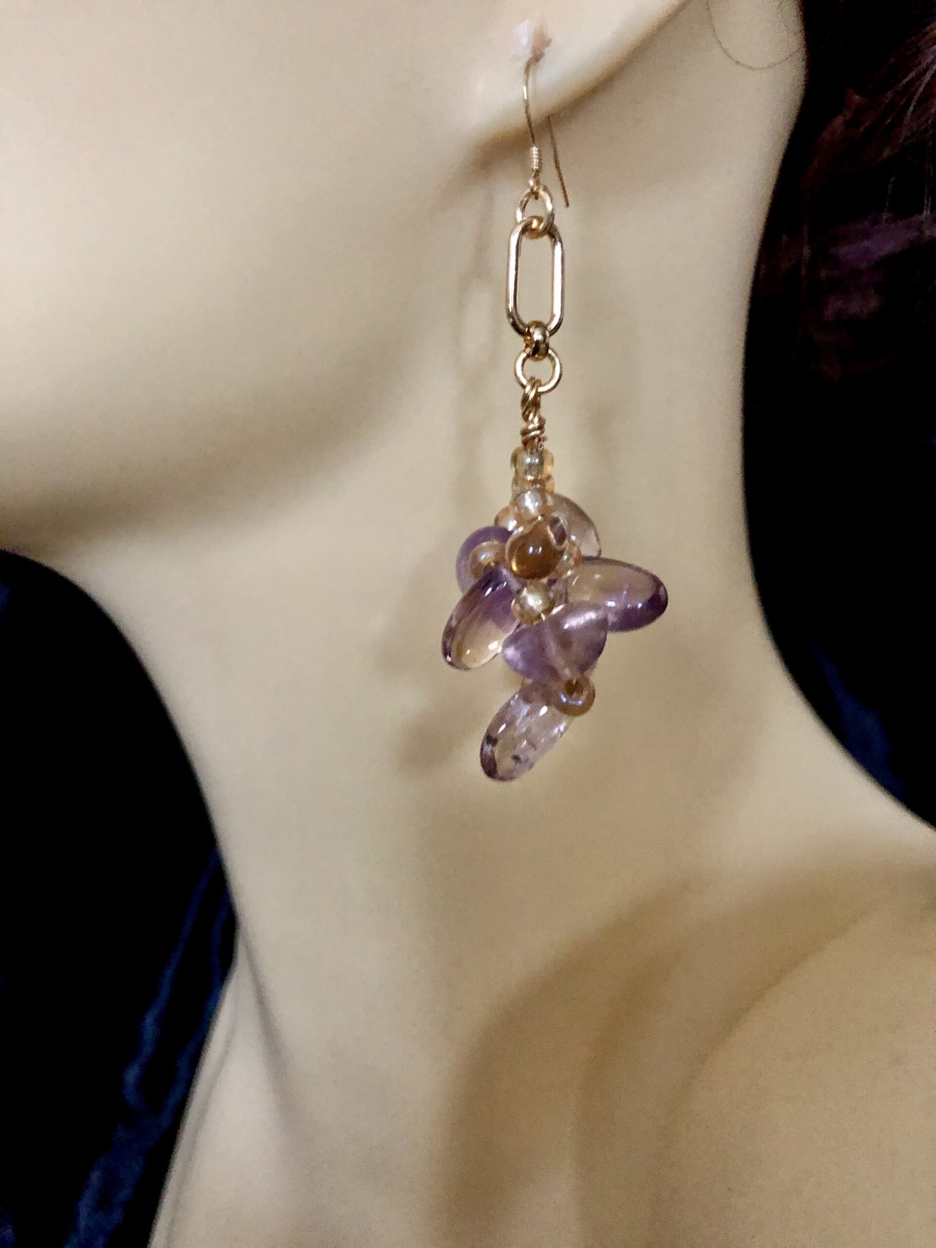 Twists of glowing Ametrine nuggets are hung from a paperclip chain link and gold plated sterling silver shepherd’s hooks.