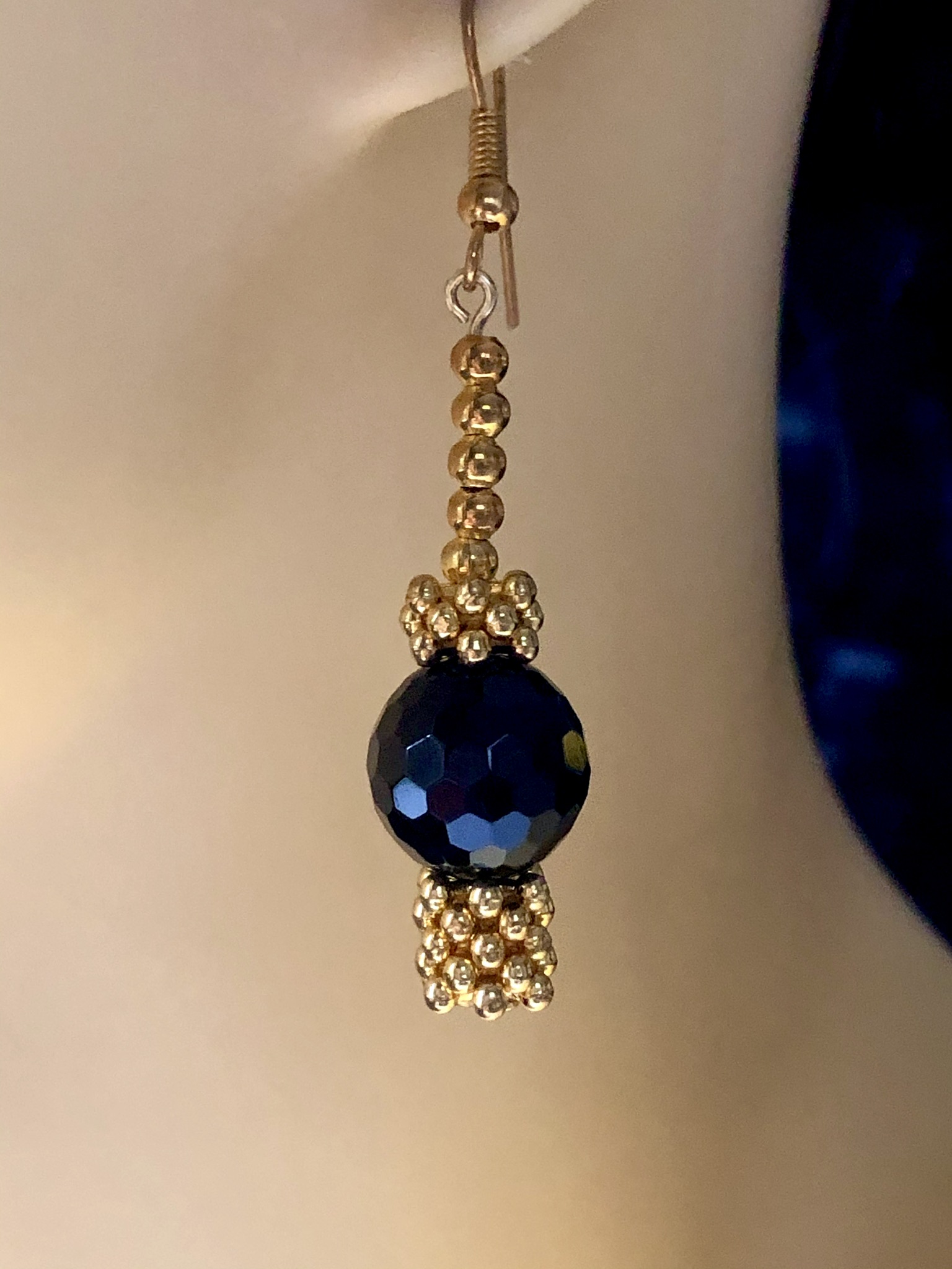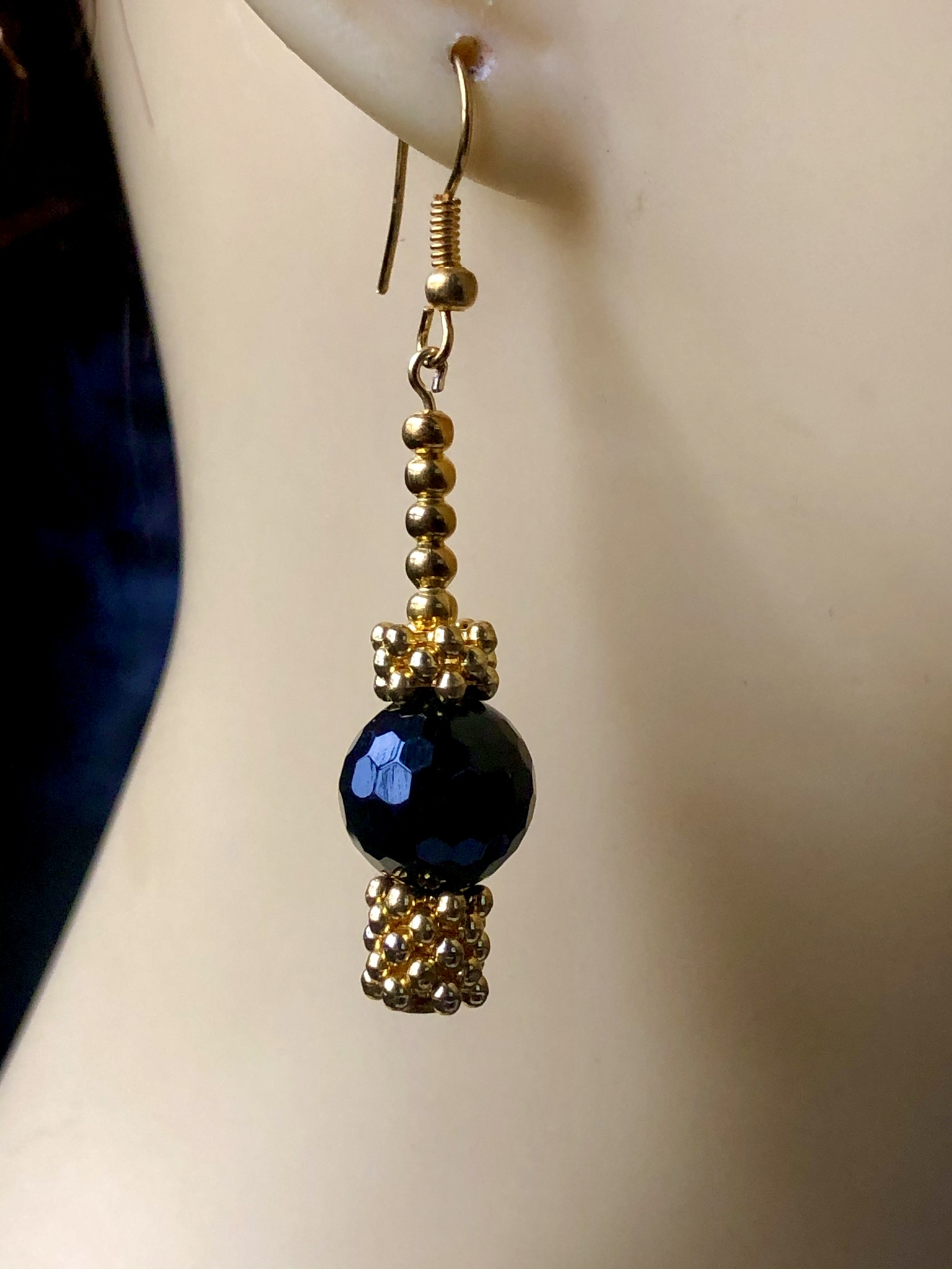 Eye catching faceted Black Agate stones which twinkle in the light contrast with gold tone spacer beads and set onto gold tone shepherd’s hooks. A perfect complement to a smart little  black dress.