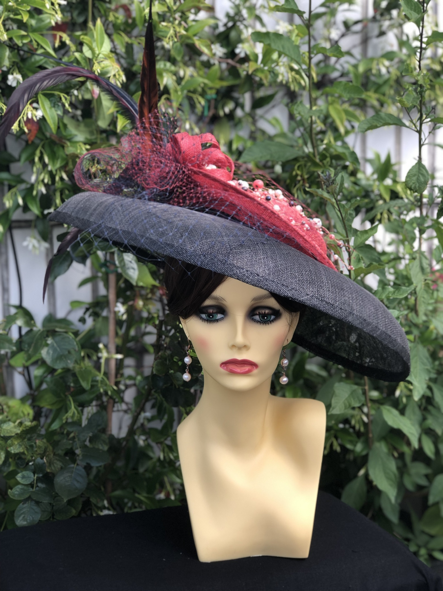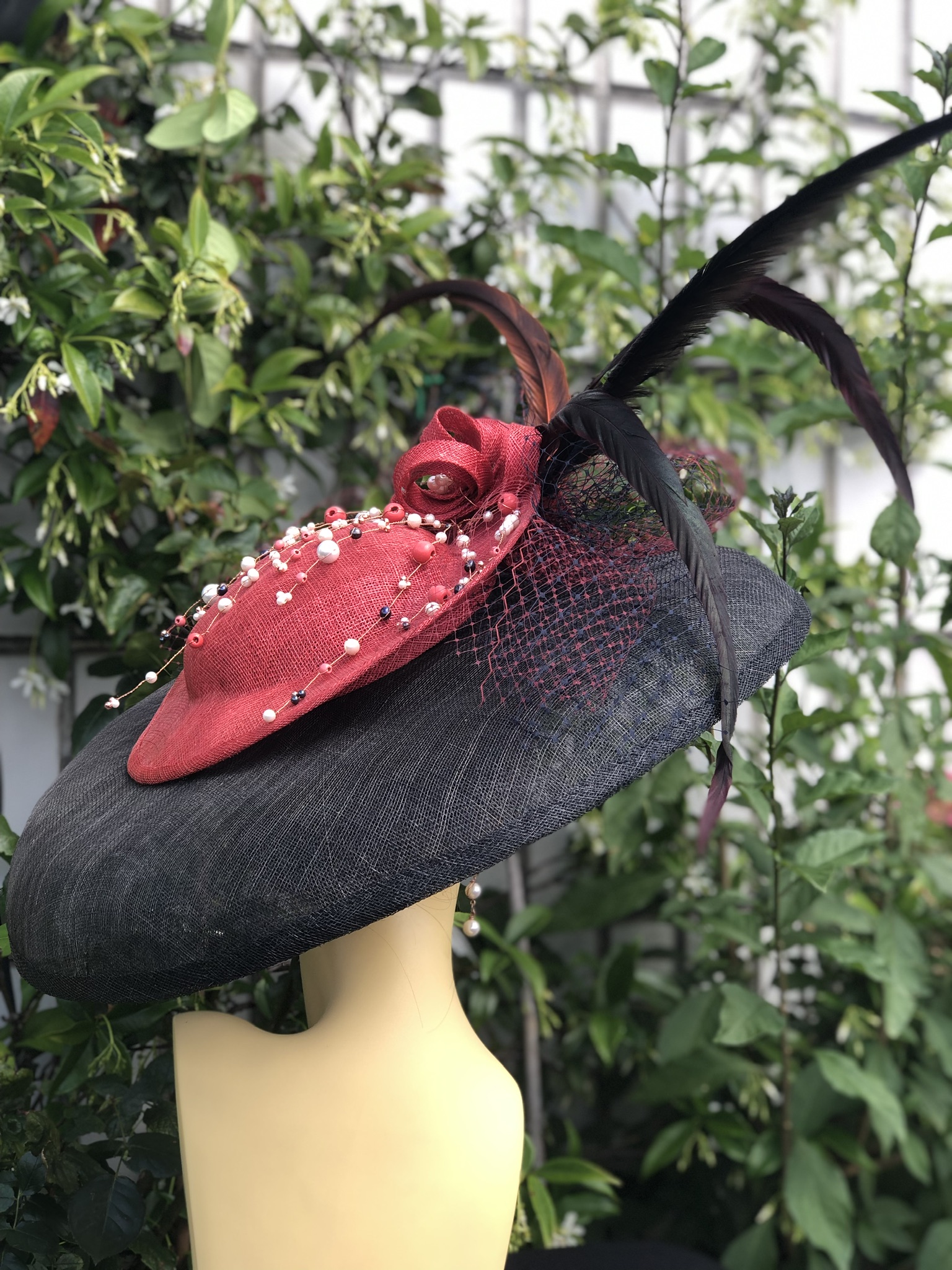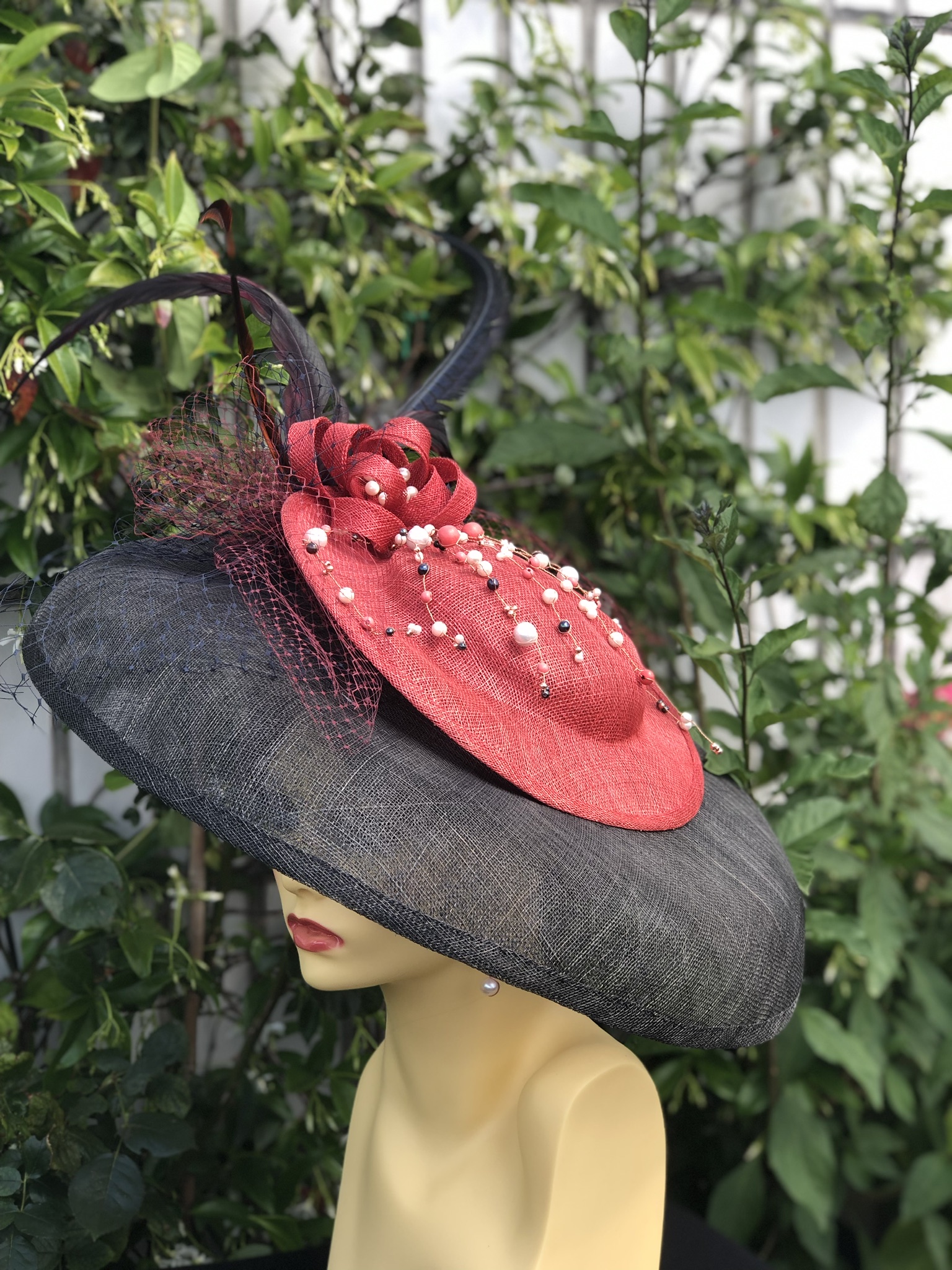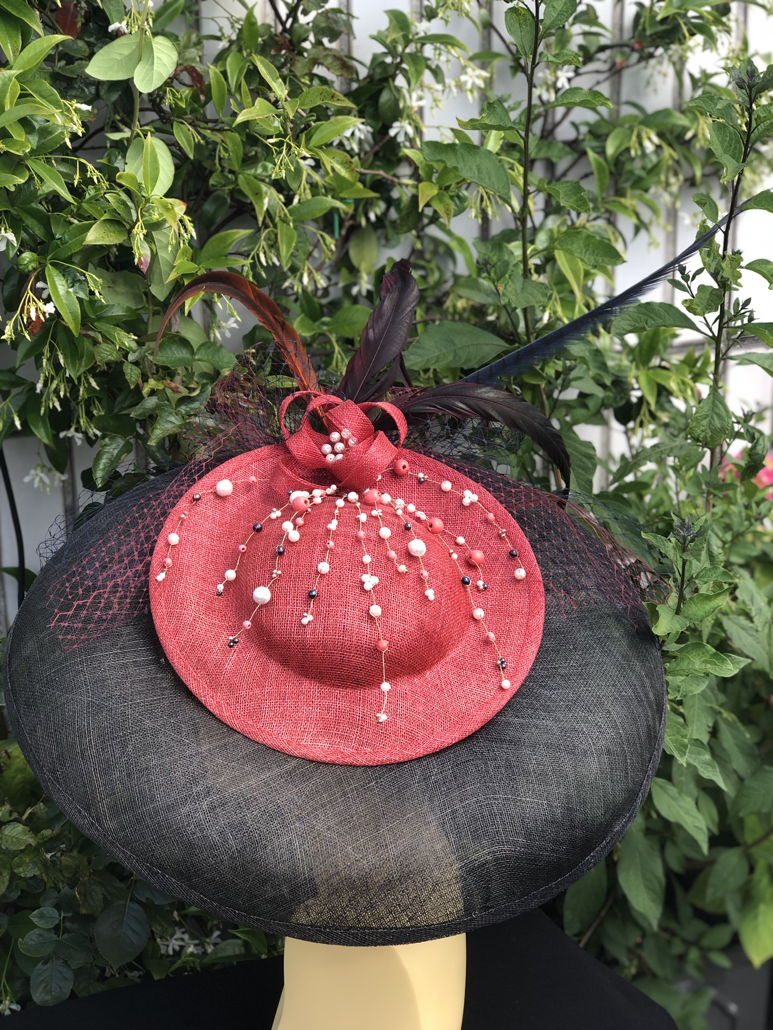 Head band mounted embellished Fascinator. Double disc Sinamay crown disc trimmed with twists of pearl and coral beads and mix of feathers.