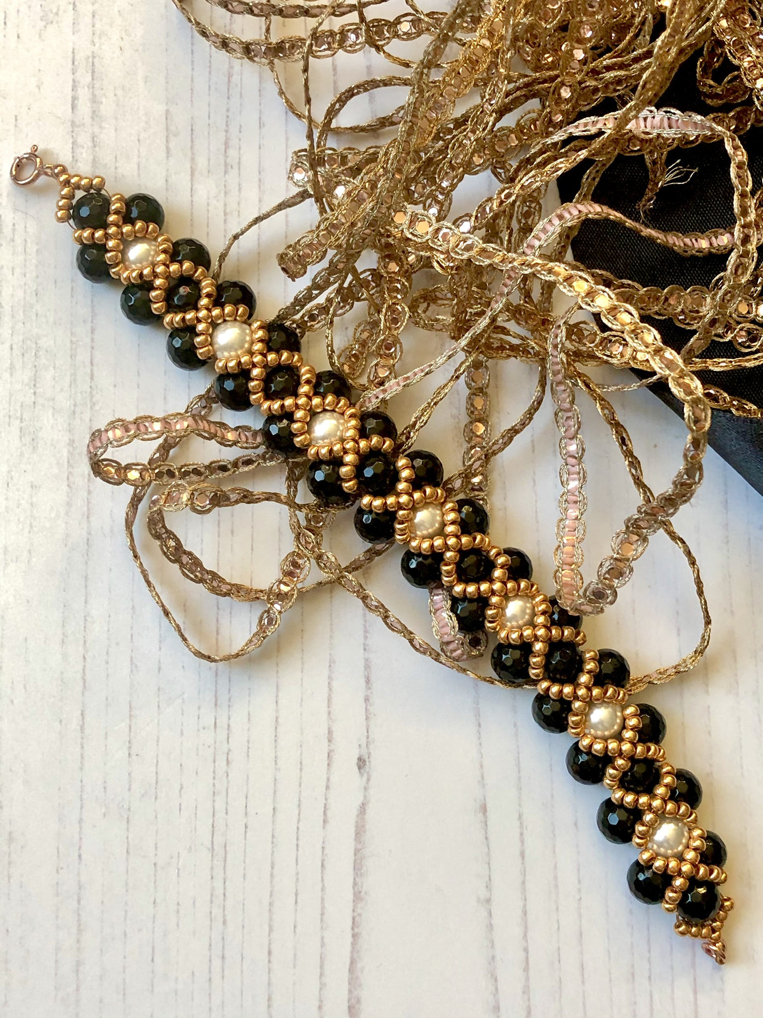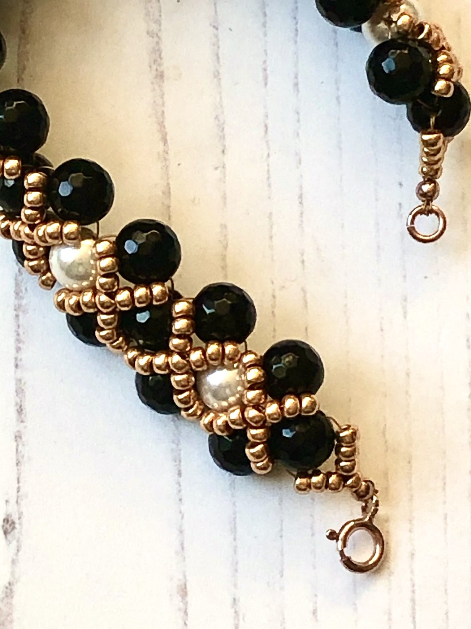 Fluid multi strand woven bracelet made from faceted Black Spinel beads and Shell Pearls embellished with gold tone Seed Beads. Plated Sterling Silver bolt ring clasp.