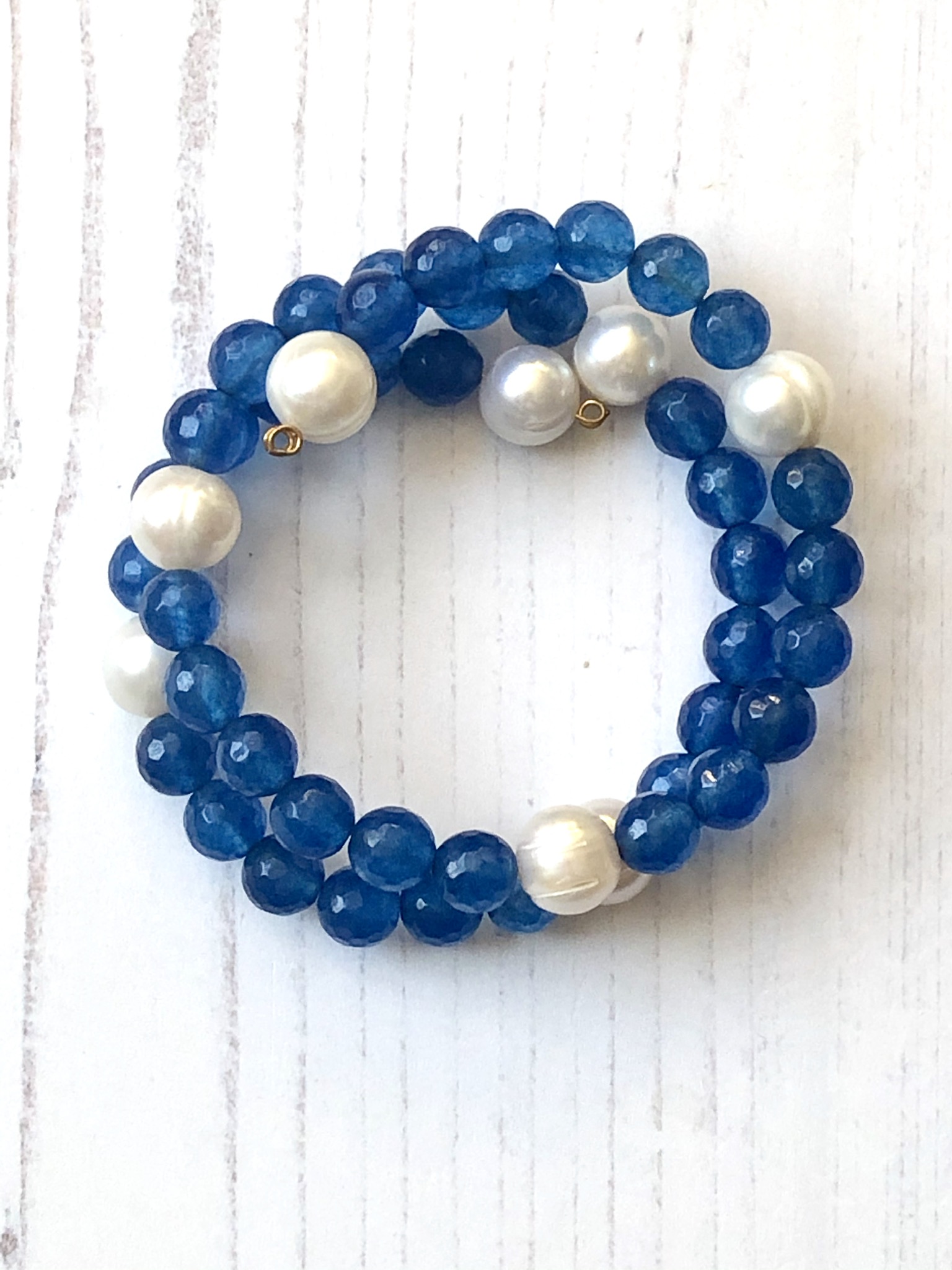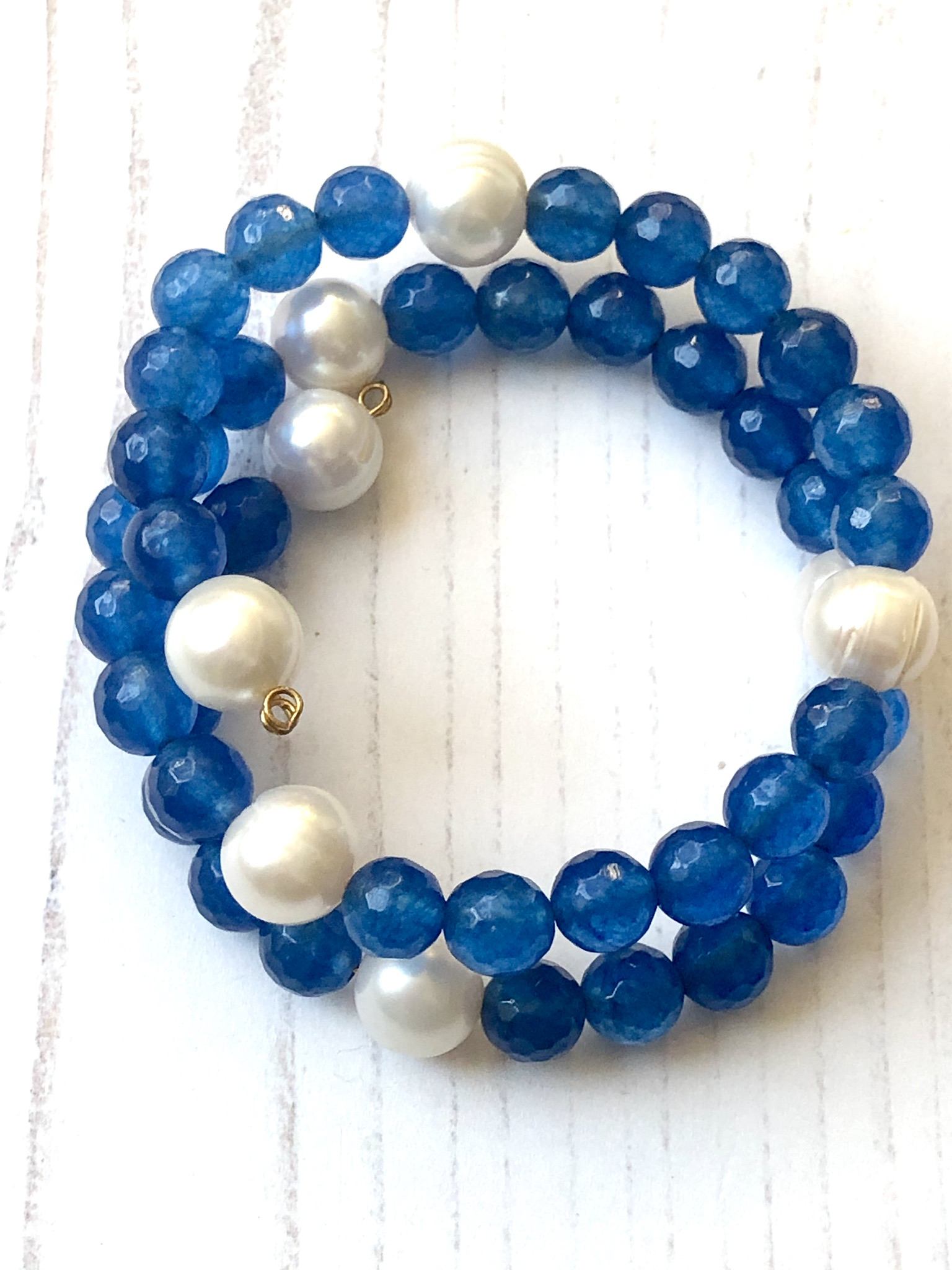 Wrap around memory wire bracelet made from lagoon blue dyed faceted Quartz beads and Freshwater Pearls.