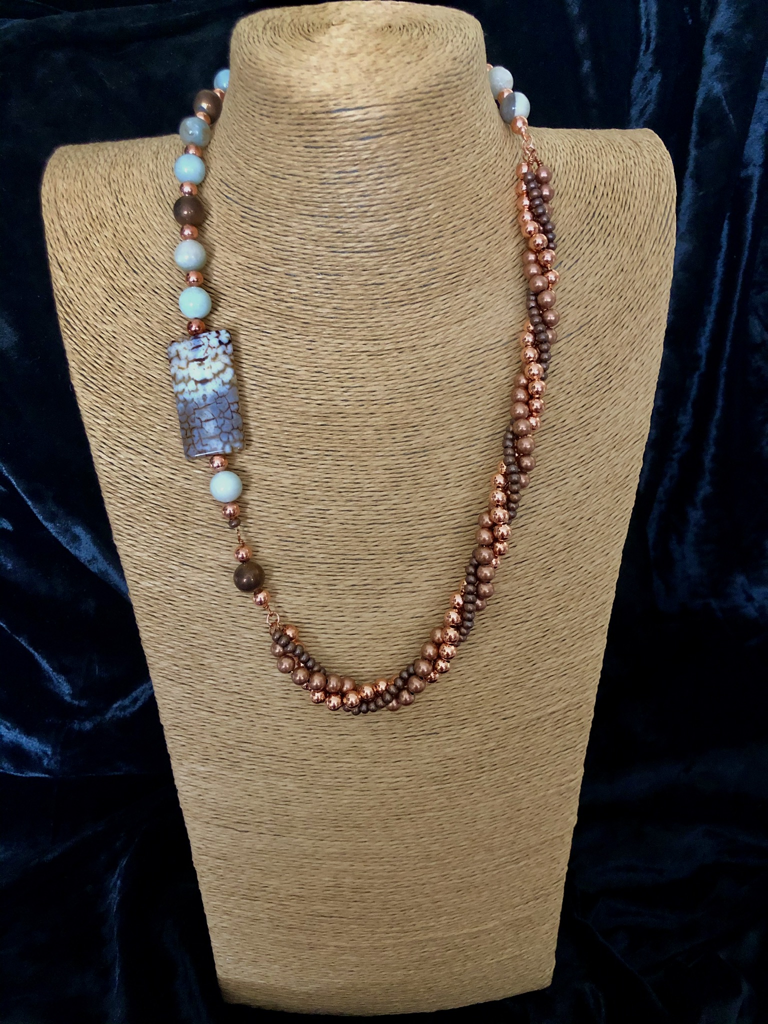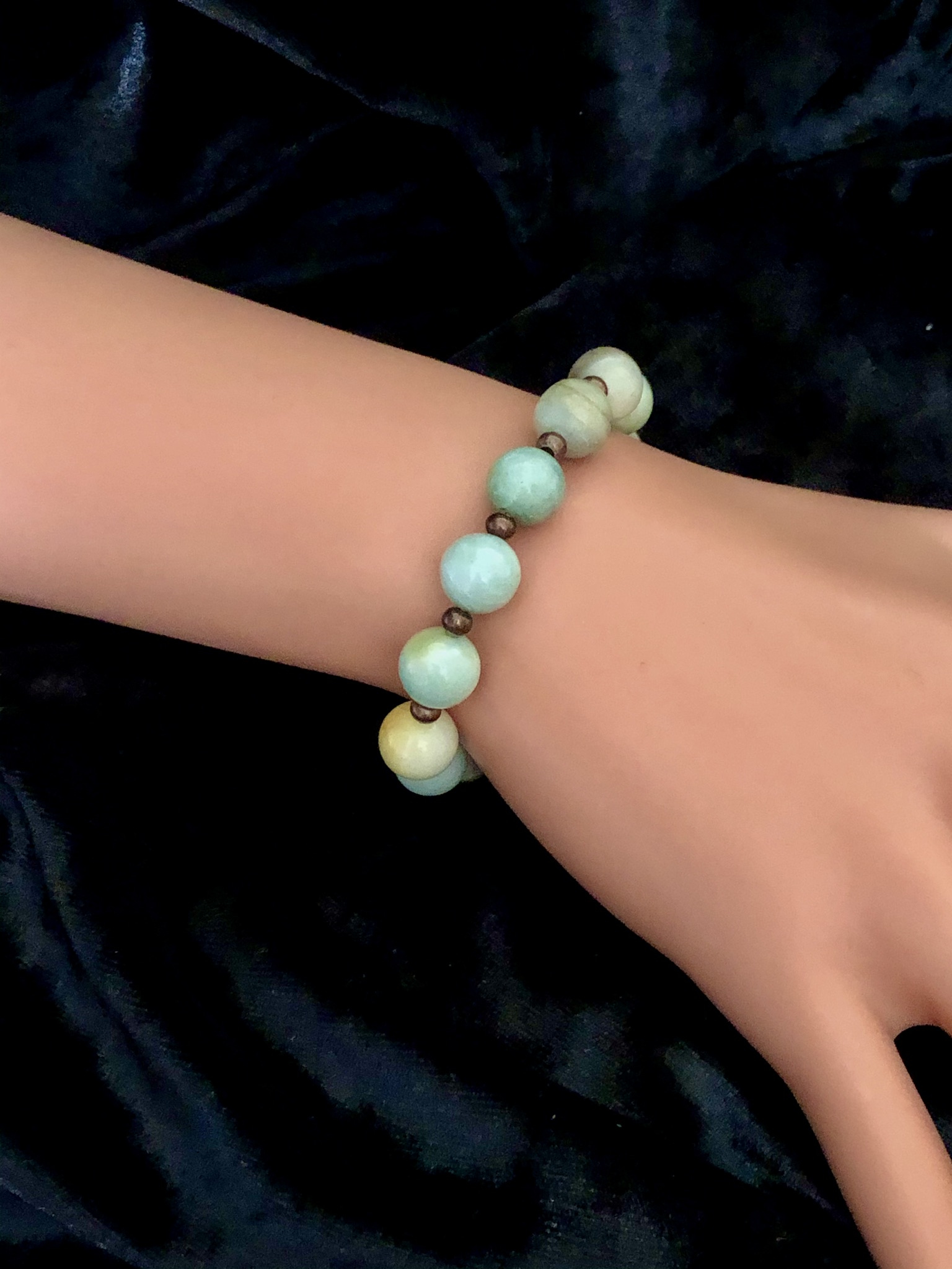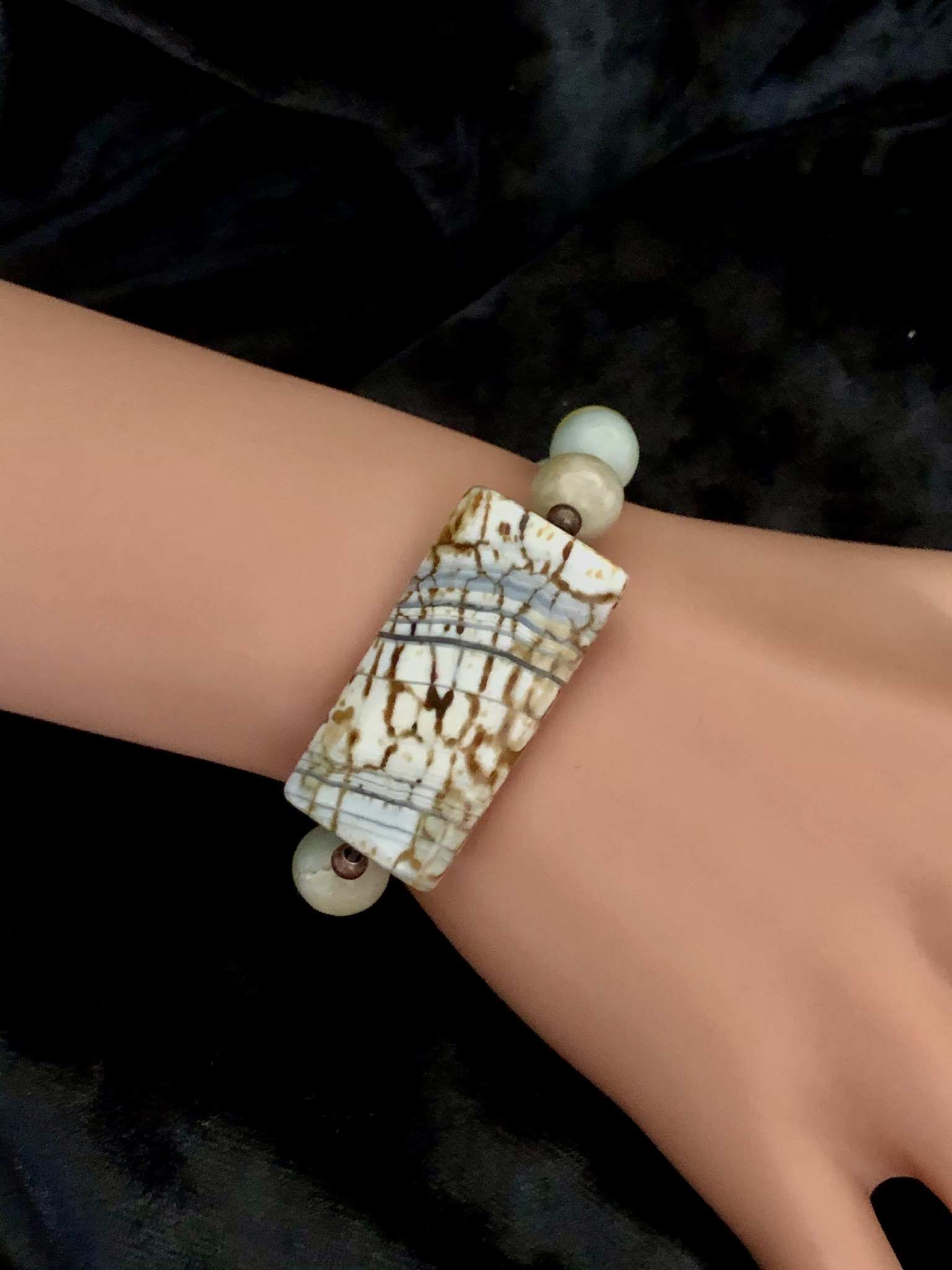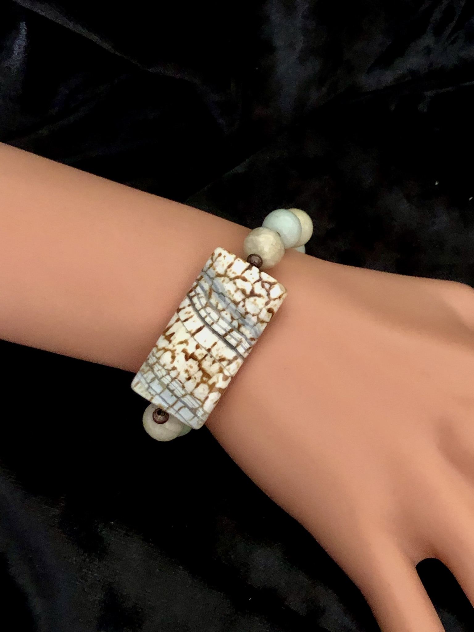 Eye-catching stretchy bracelet made from a 4cm rectangular Cappuccino Agate and minty green Amazonite beads with bronze colour spacer beads.