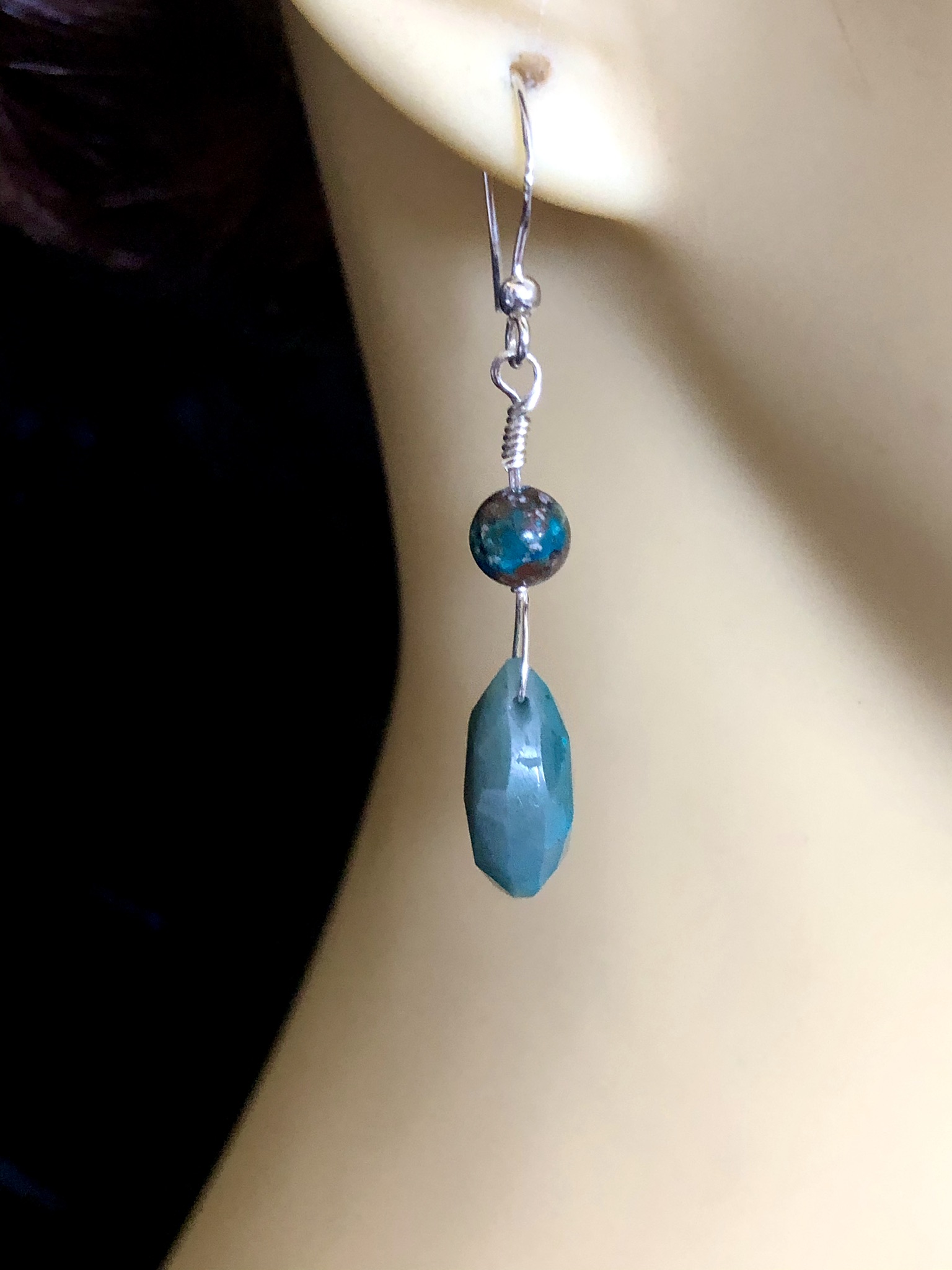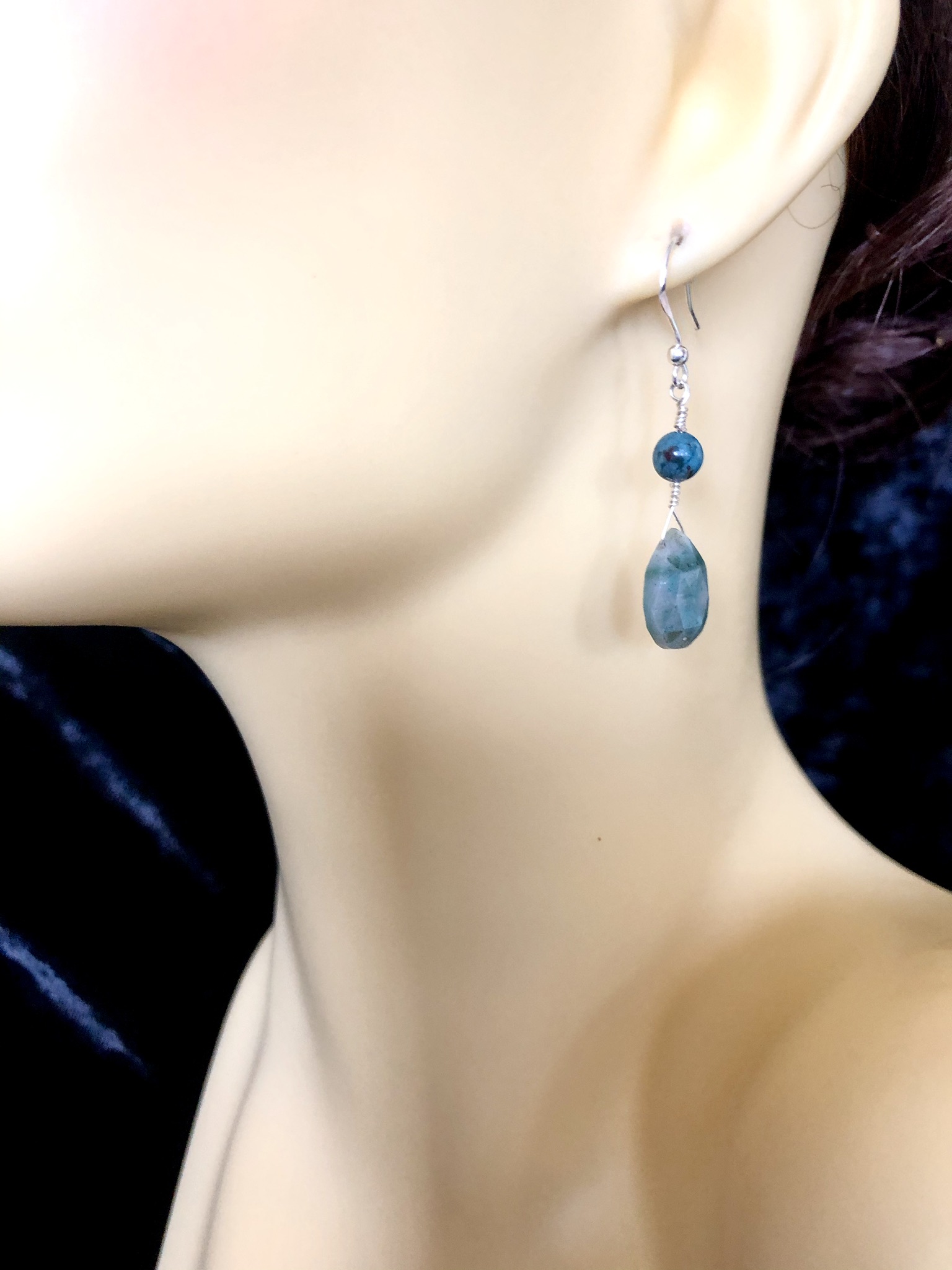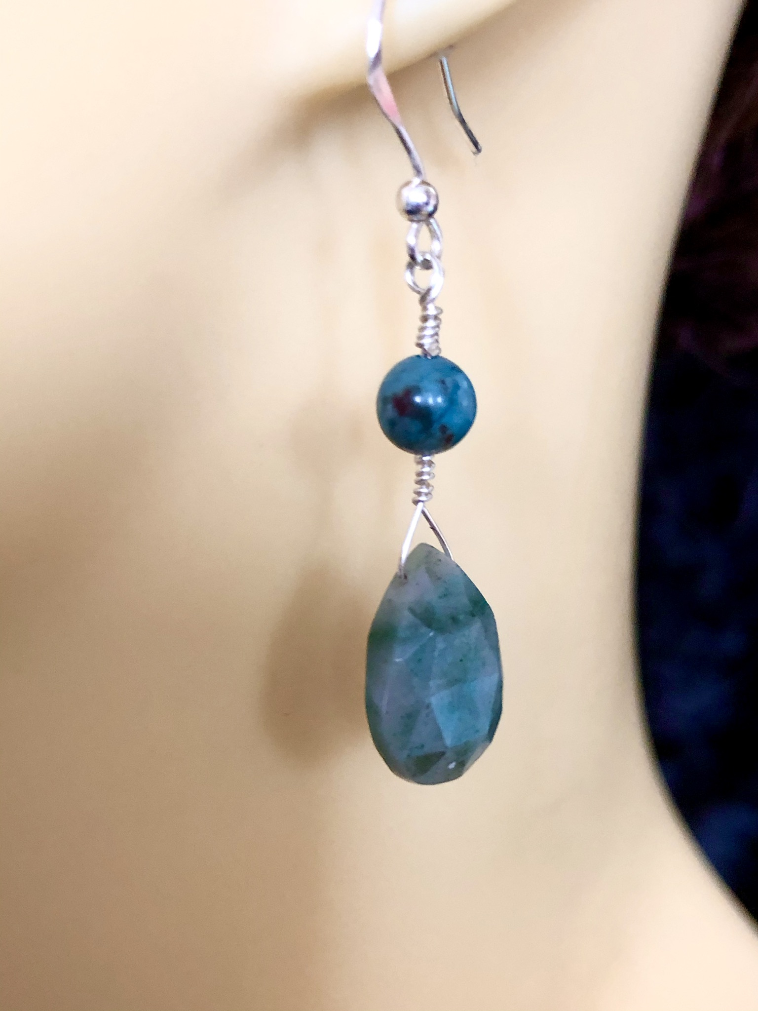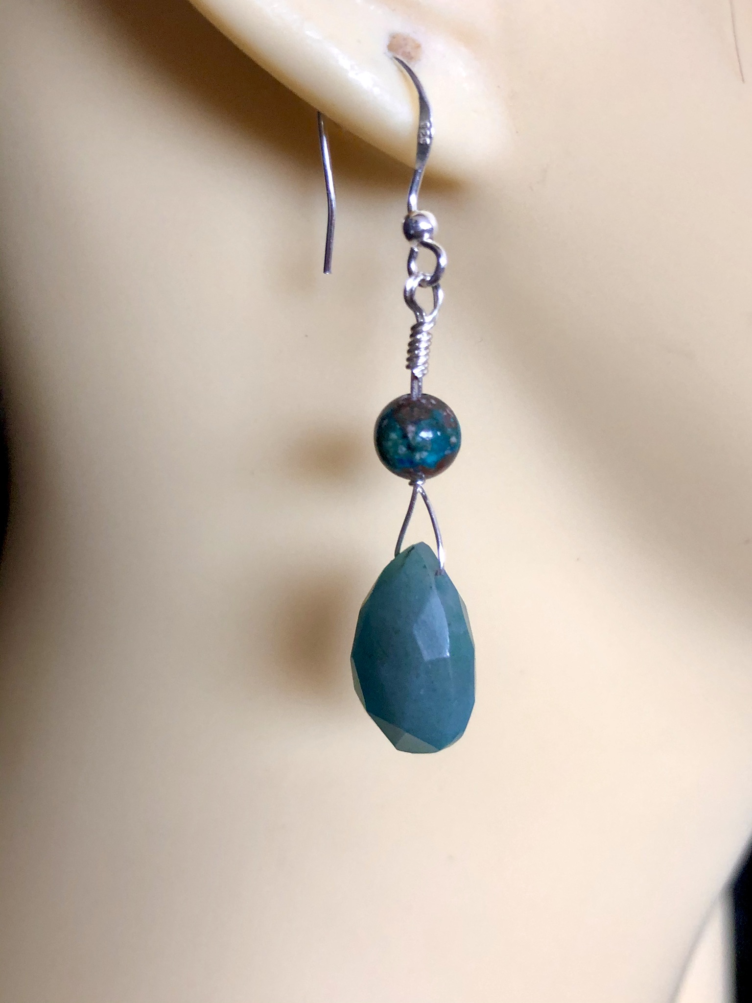 Chrysocolla faceted pears and round beads mounted onto 925 silver shepherds hooks.