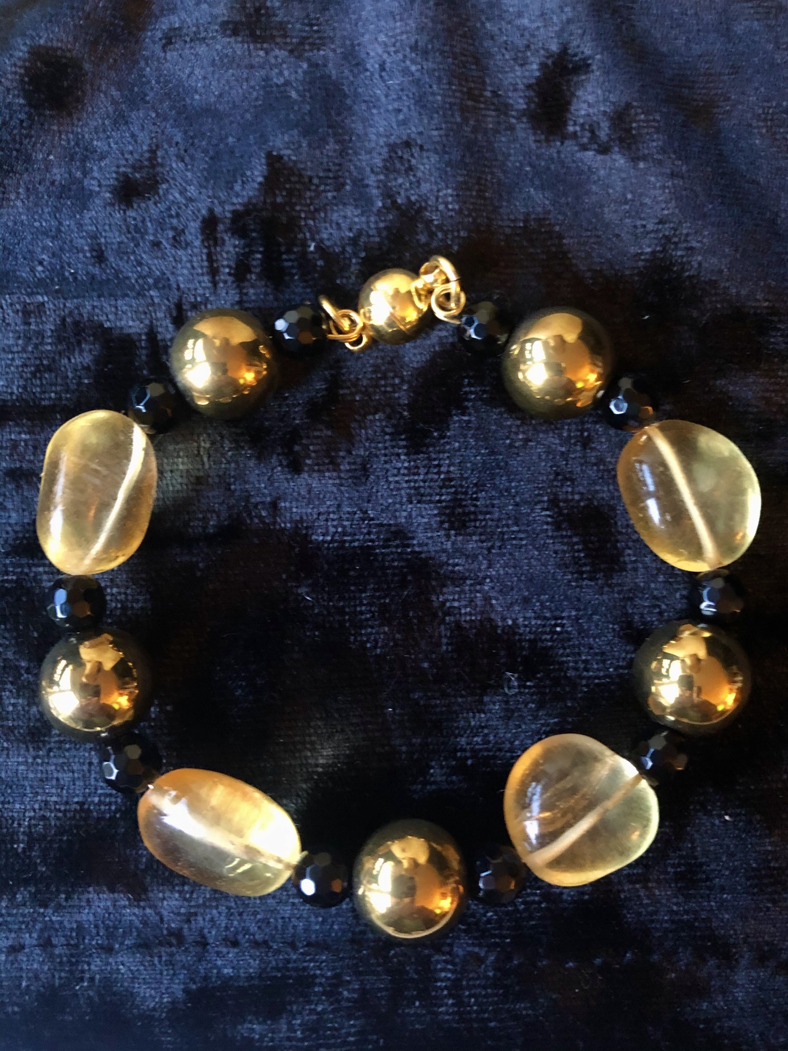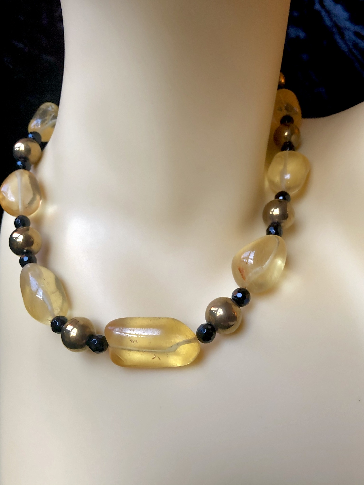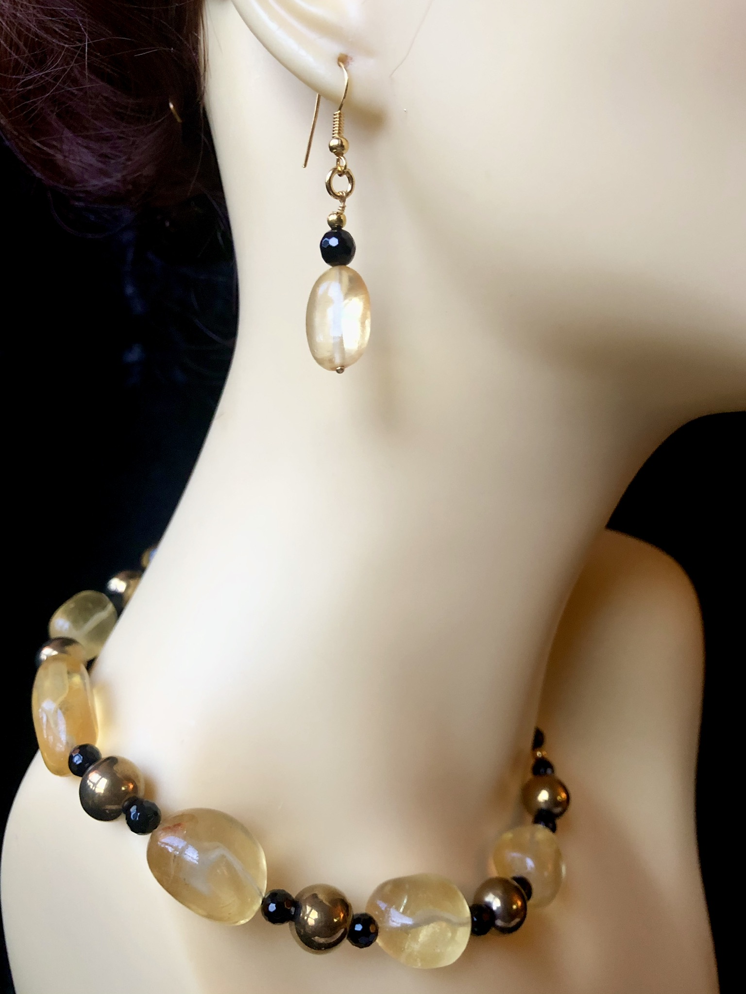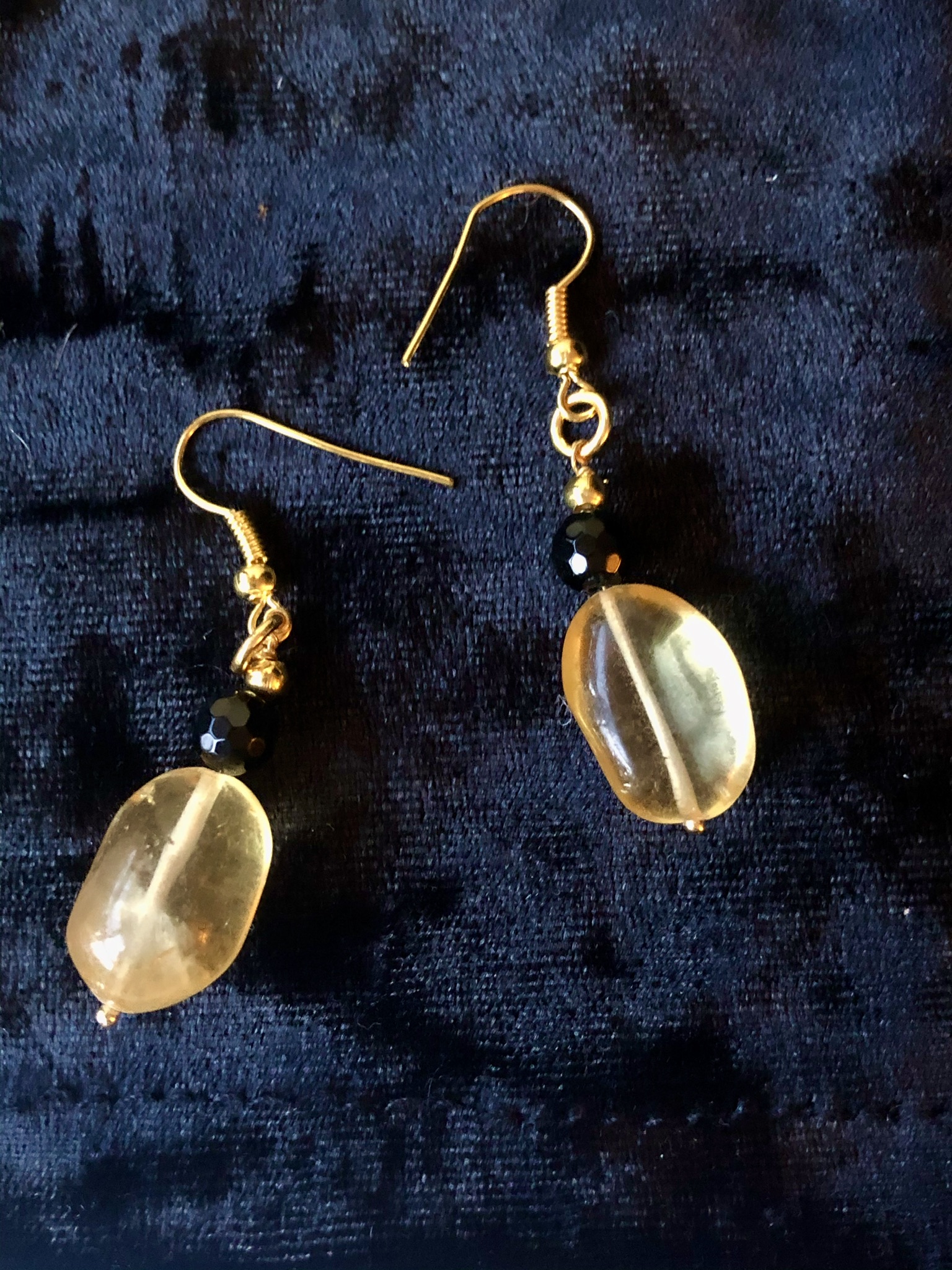 Beautiful lemon yellow Citrine nuggets and faceted Black Agate beads mounted onto yellow tone shepherd hooks.