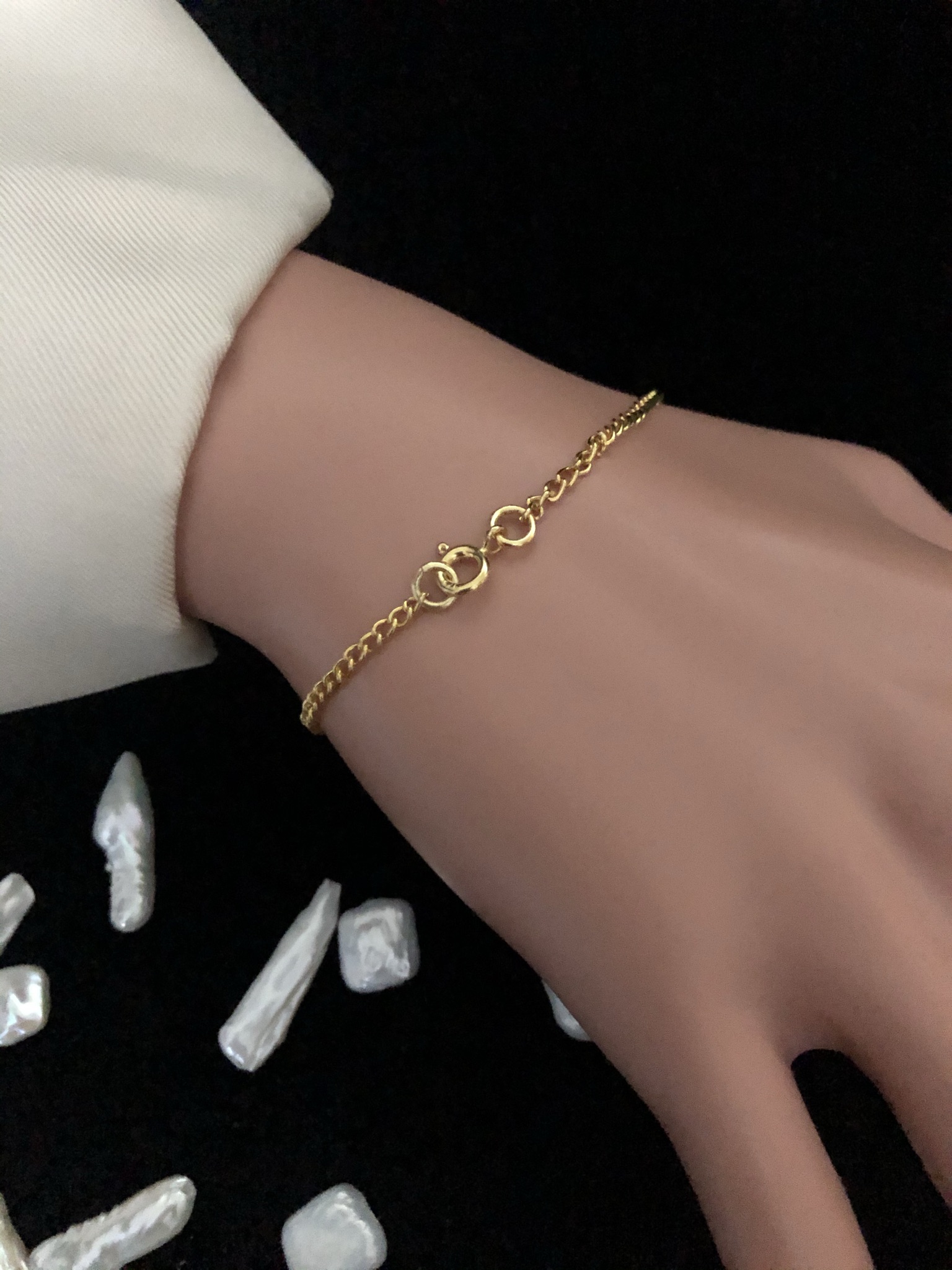 Perfect for layering – a charming light weight bracelet which has a single Freshwater Biwa Pearl mounted on a gold tone chain and gold plated silver lobster claw clasp.