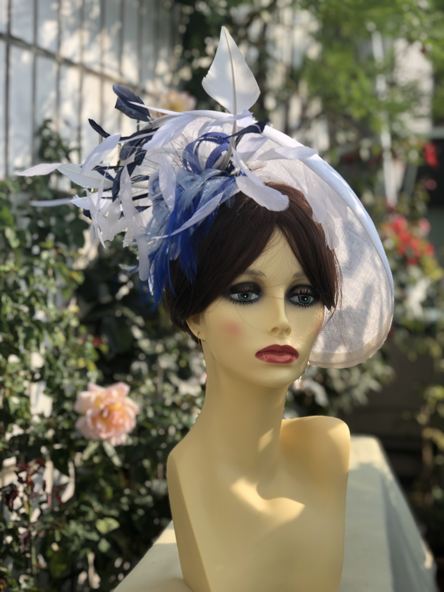 Head band mounted embellished Fascinator. Sinamay crown embellished on the underside with delicate cornflower-blue flowers, feathers and quills.