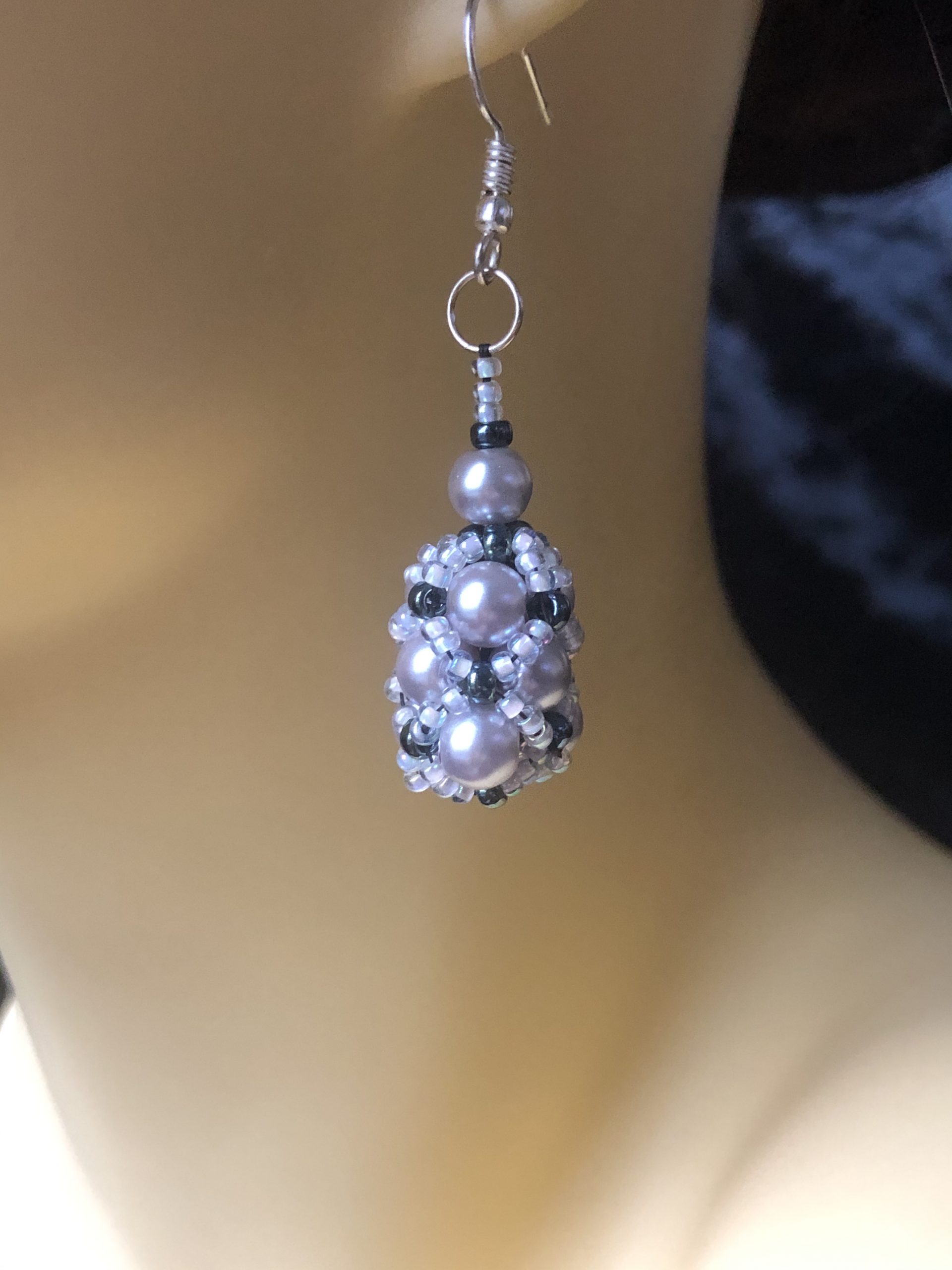 Pale grey shell pearls with blue accent seed beads mounted onto silver tone shepherd hooks.