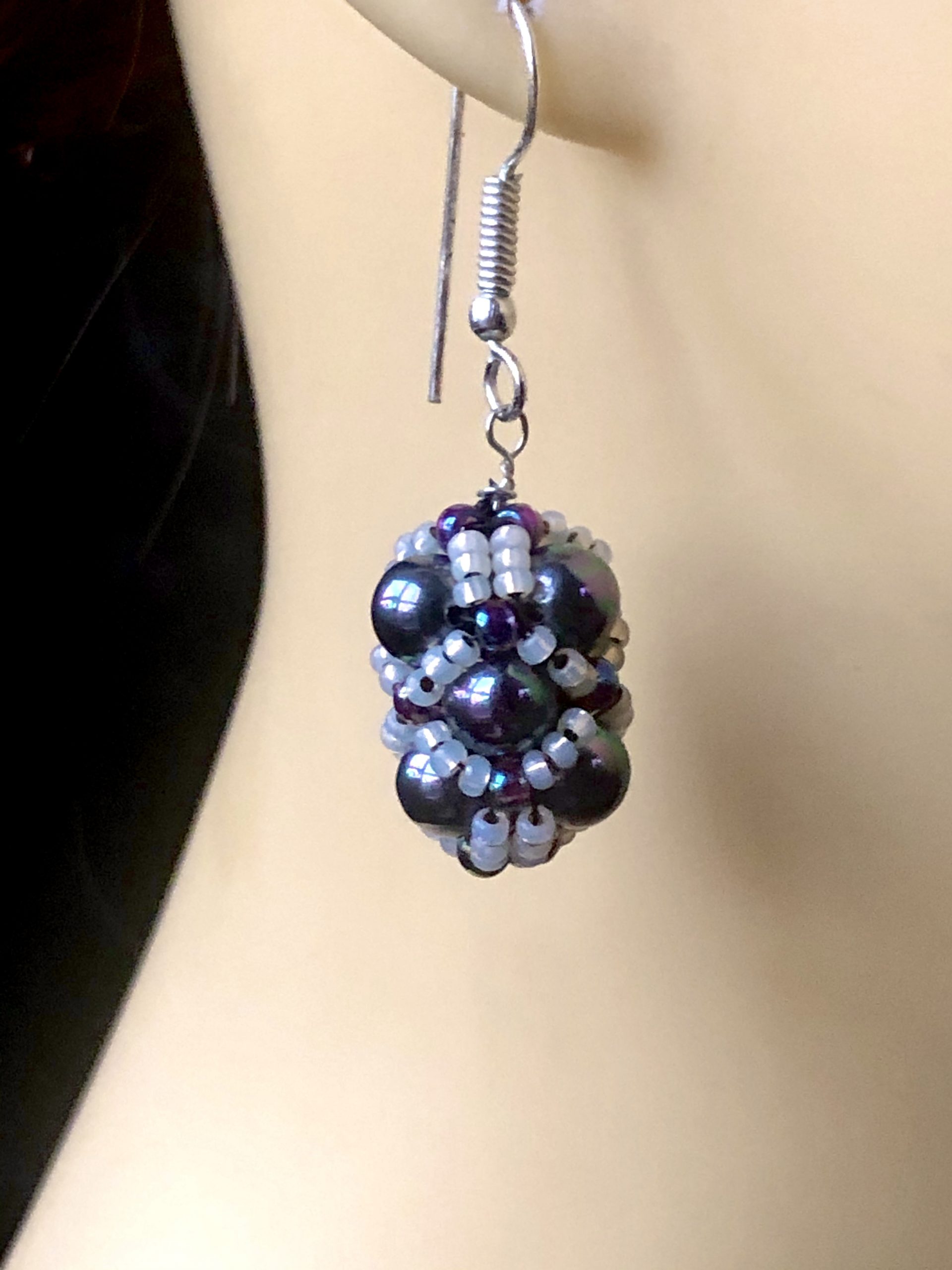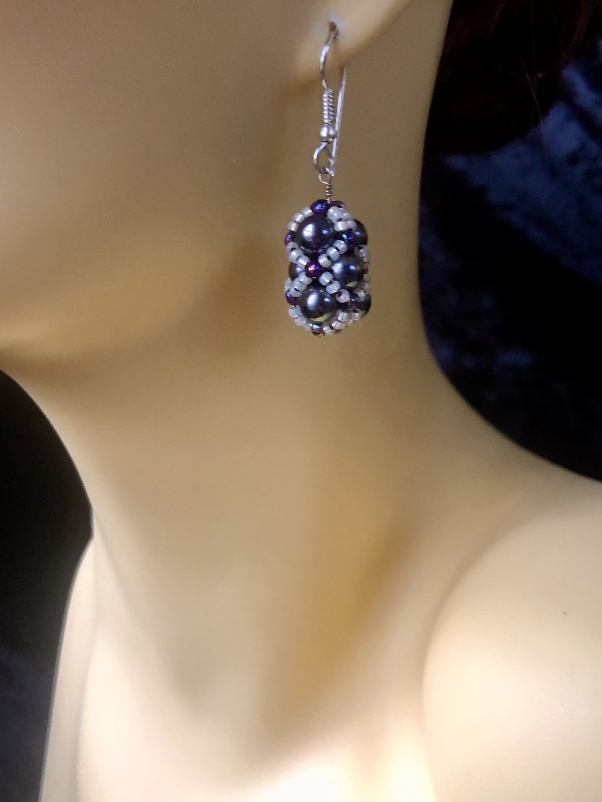 Peacock shell pearls and seed beads mounted onto silver plated shepherd hooks.