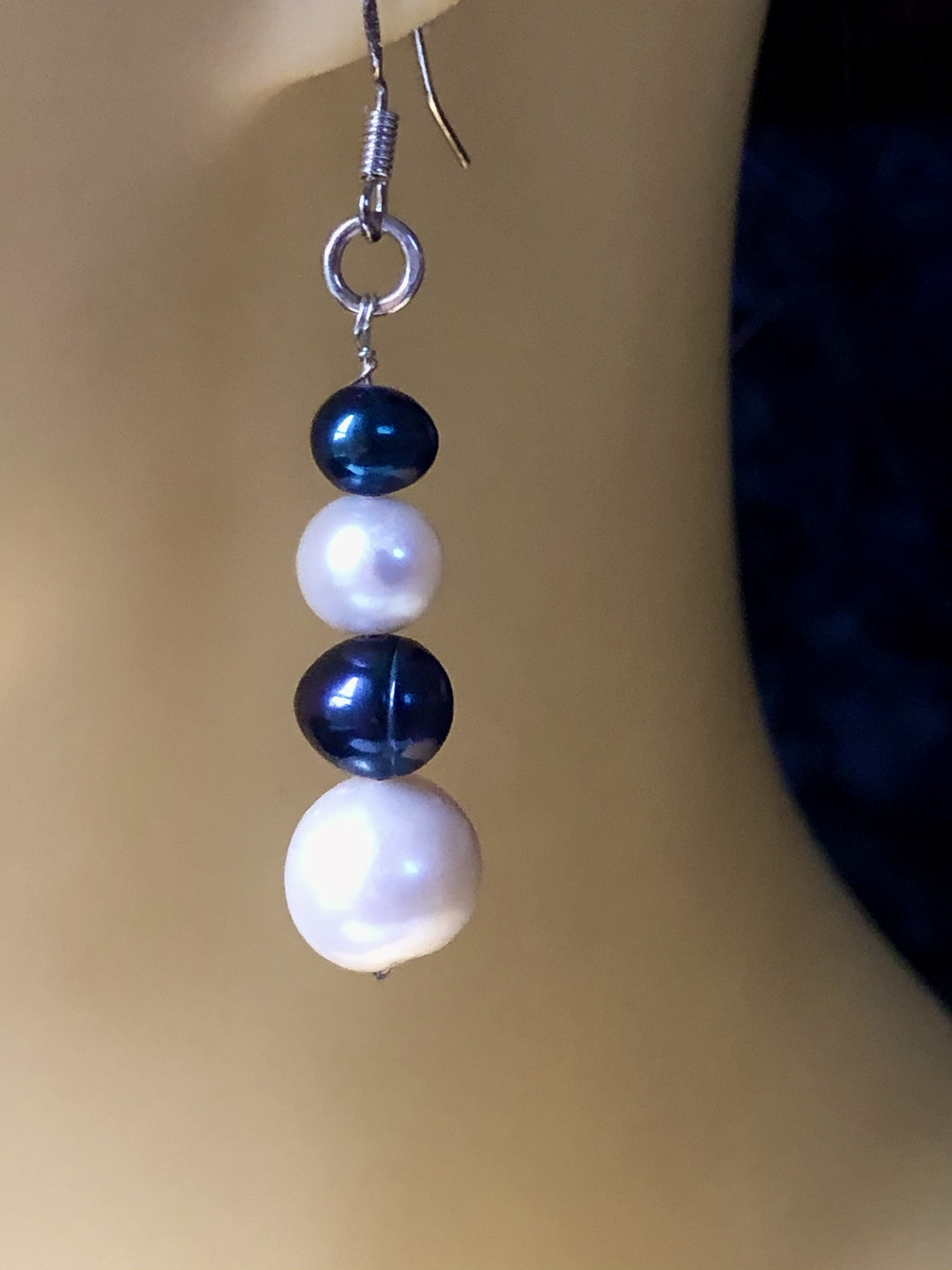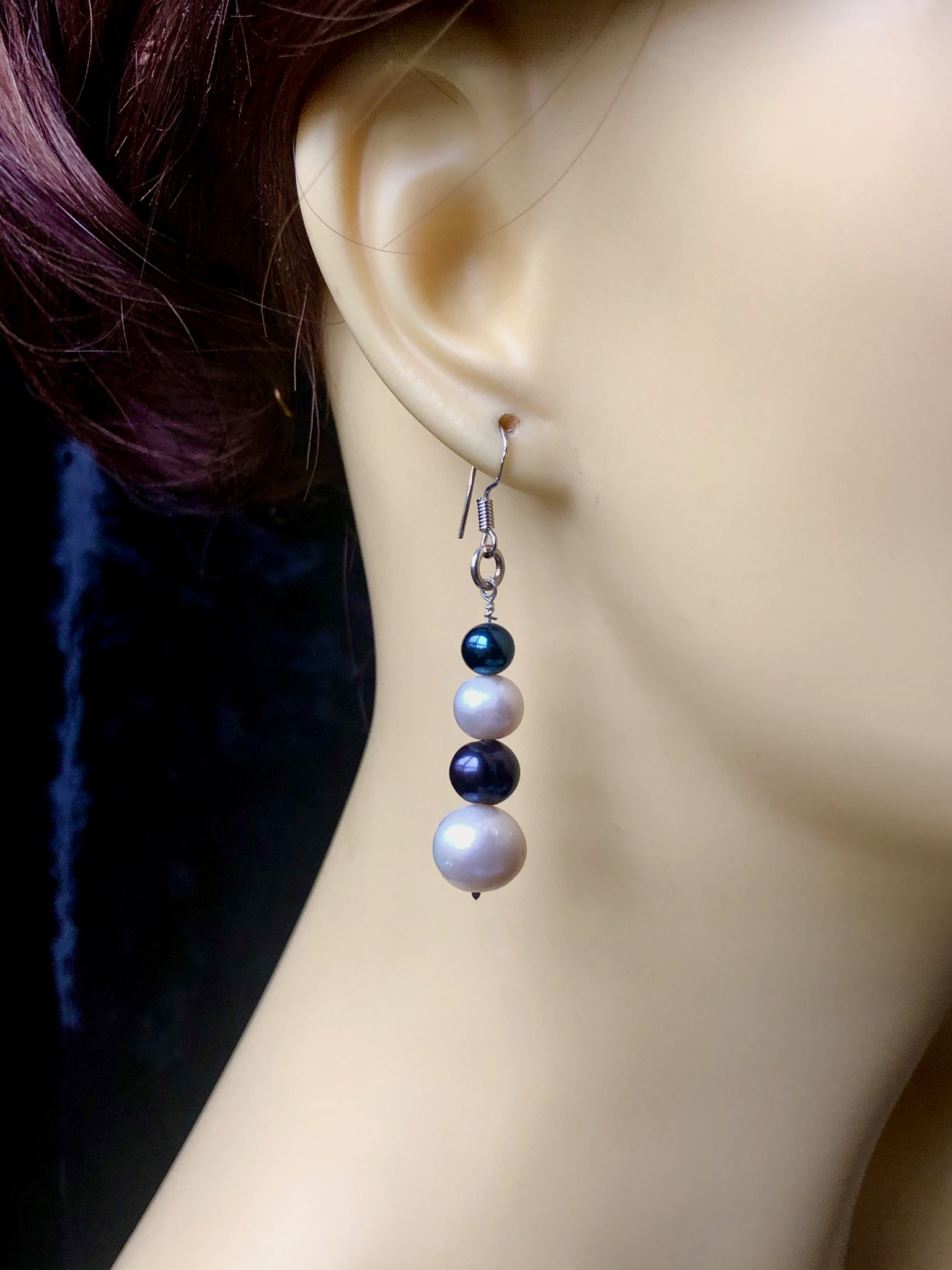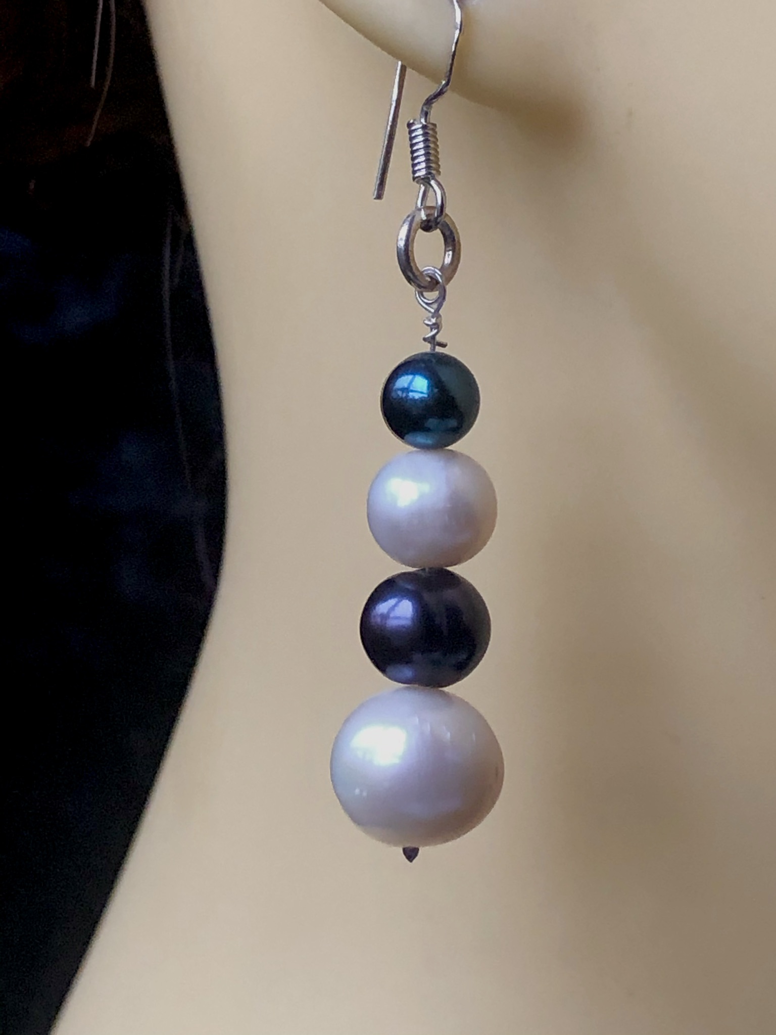 White and black graduated pearls form these beautiful long length monochrome earrings mounted onto sterling silver shepherd’s hooks.
