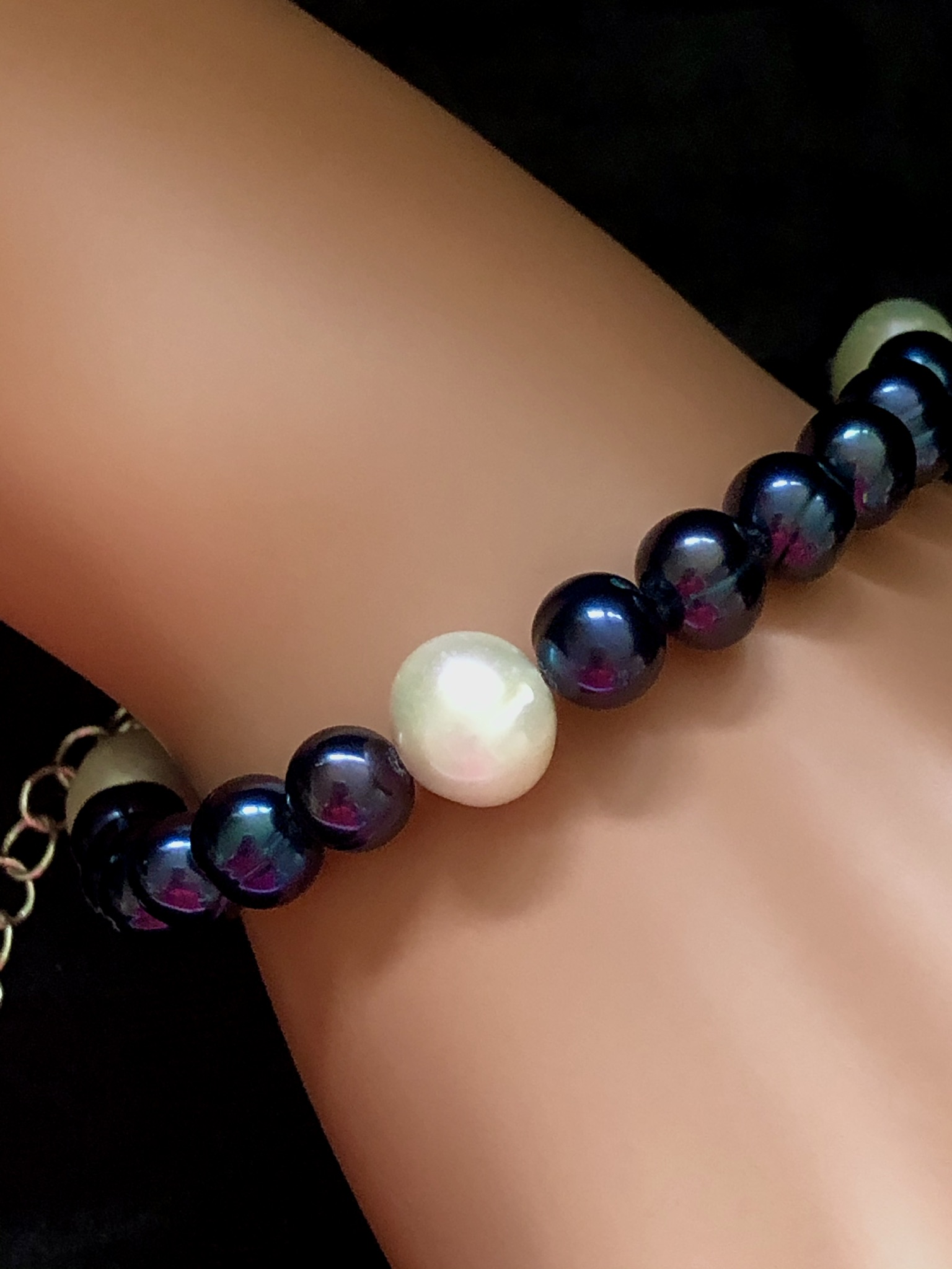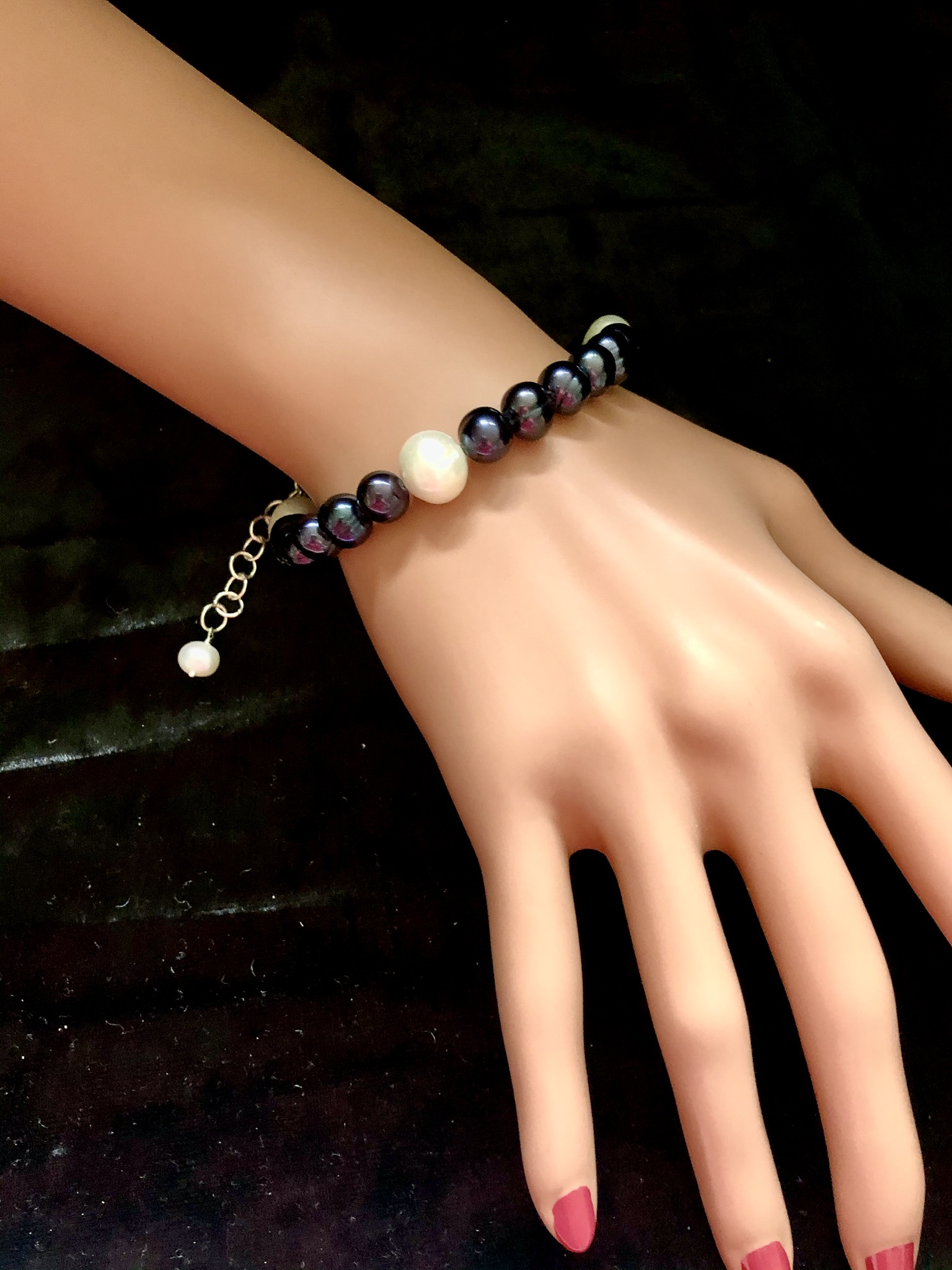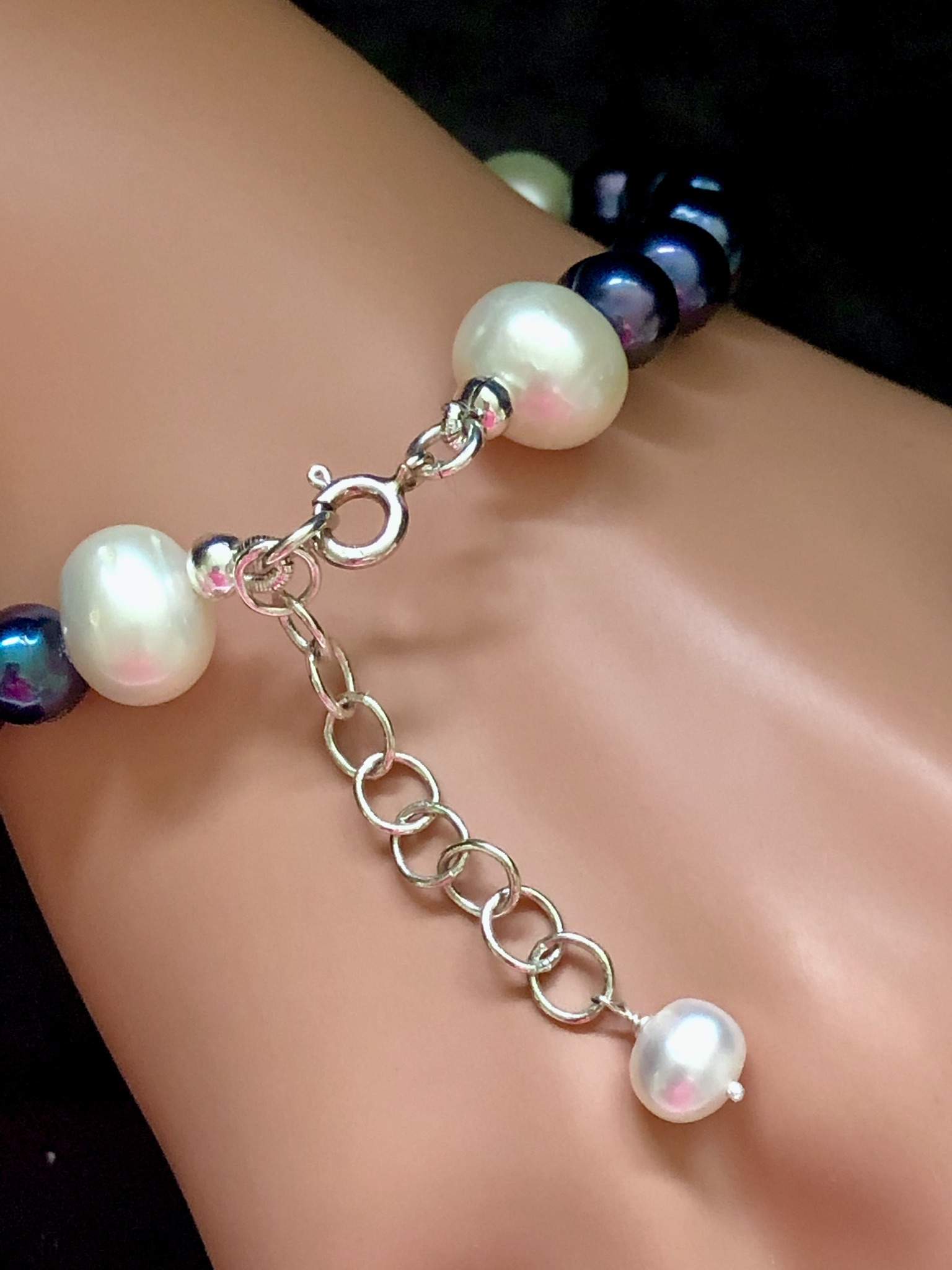 Extendable bracelet made from lustrous black Freshwater Pearls (8-10mm) and contrasting white pearls (10 – 11 mm). Extender chain and s