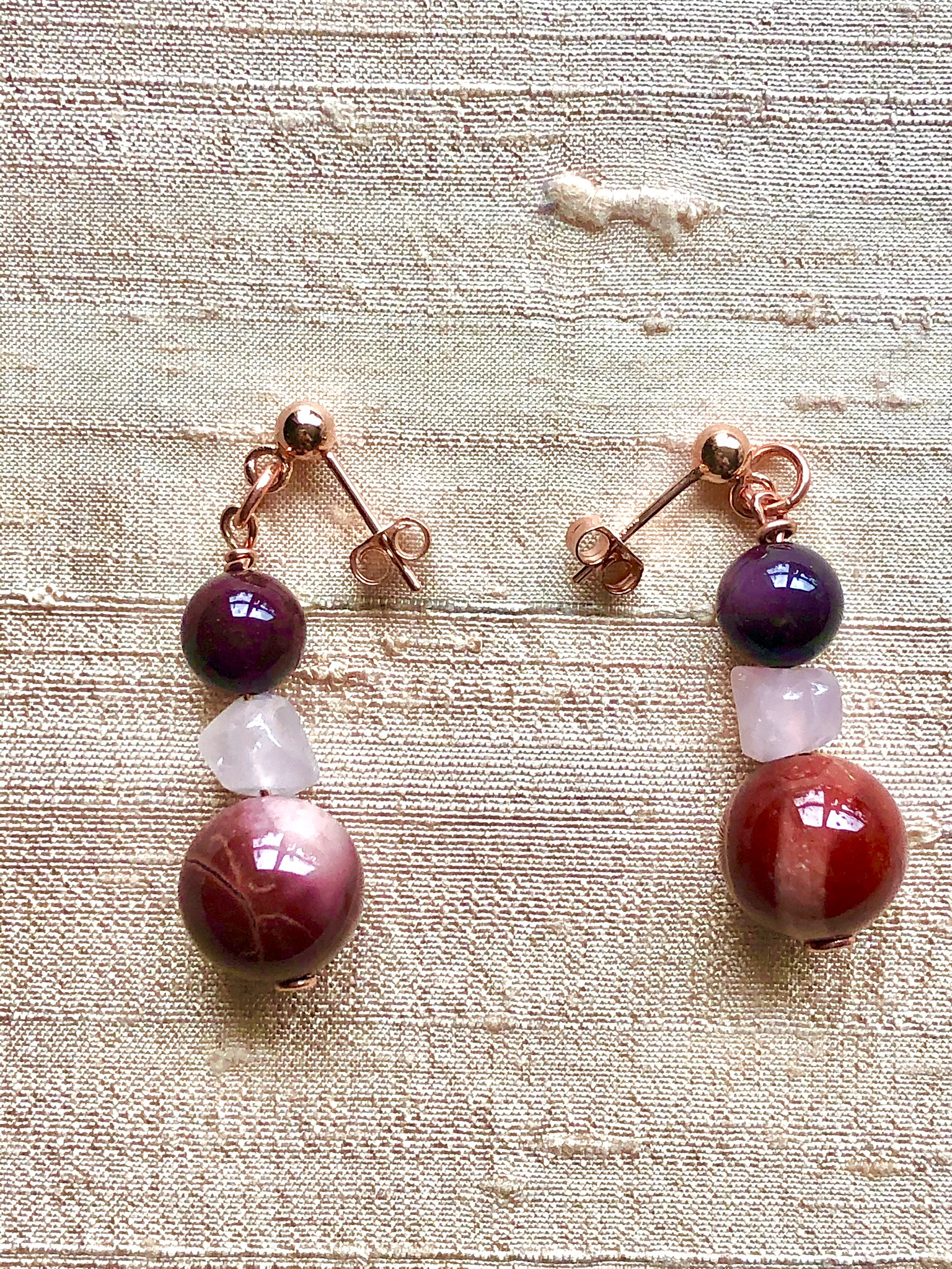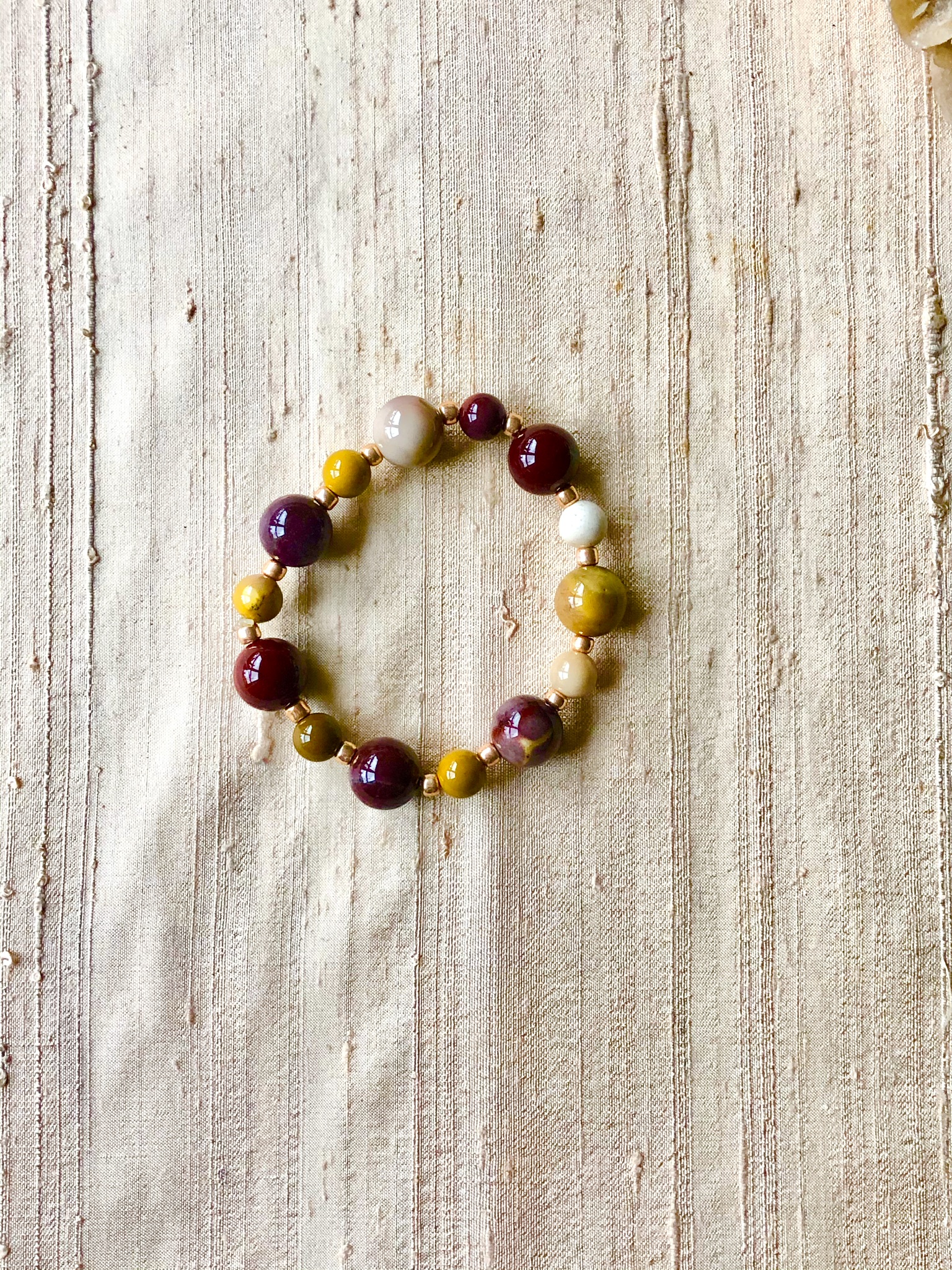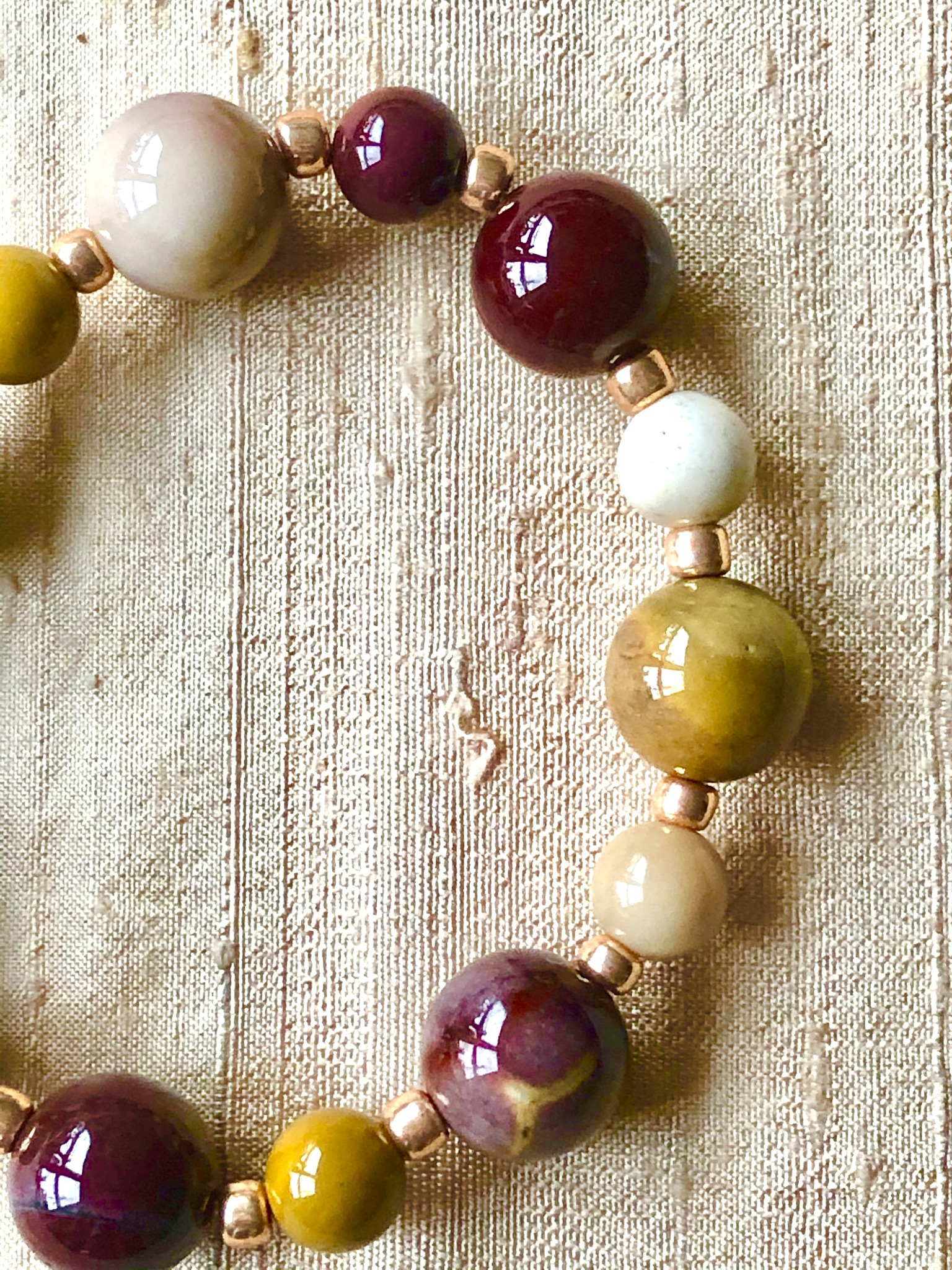Stretchy bracelet made from 12mm and 8mm Australian Mookite round beads with gold coloured spacer beads.