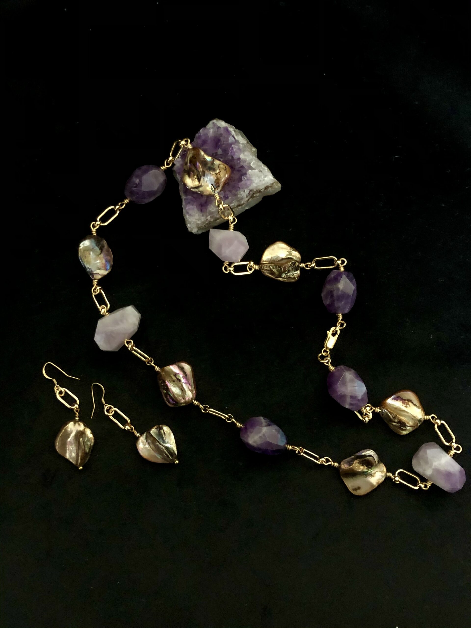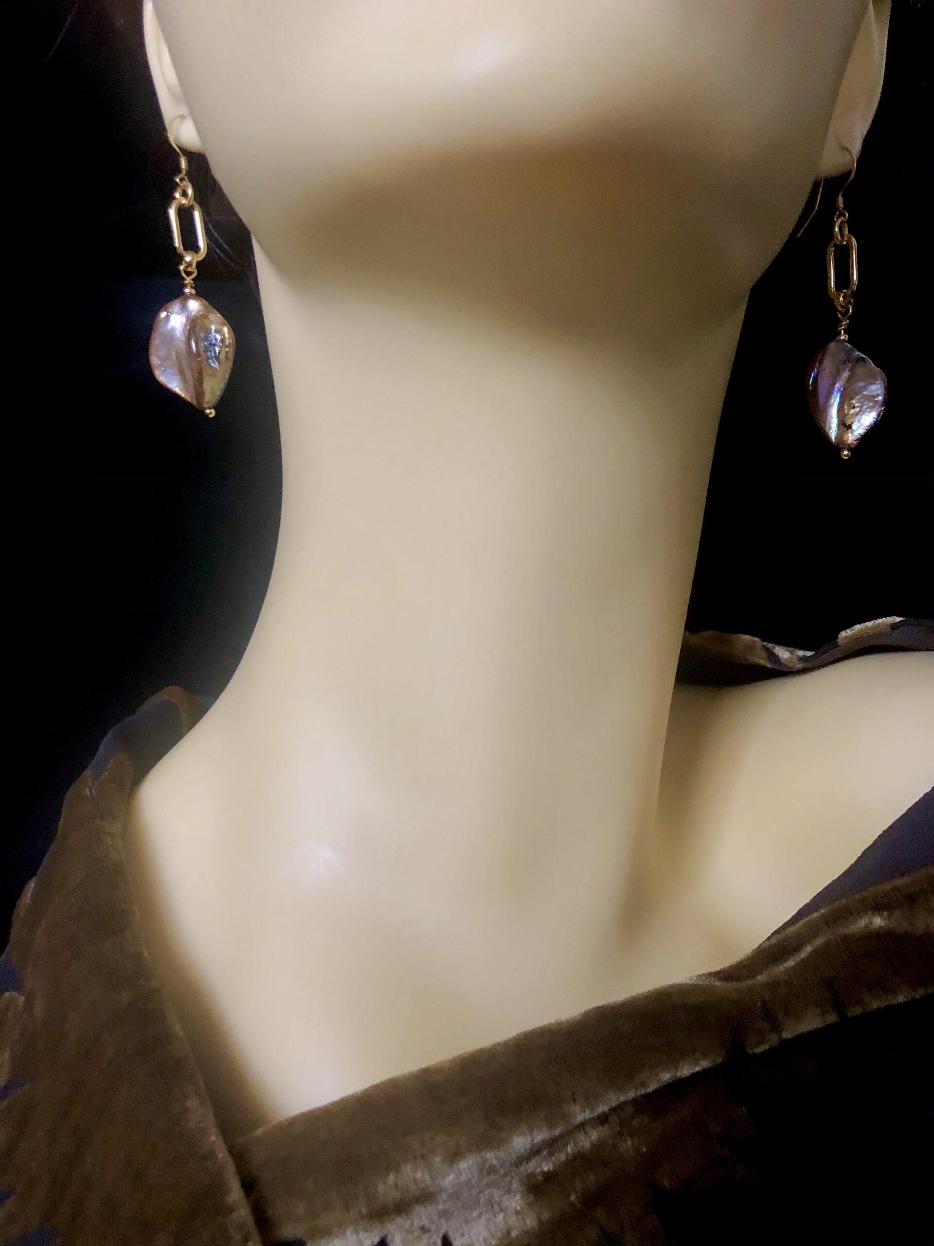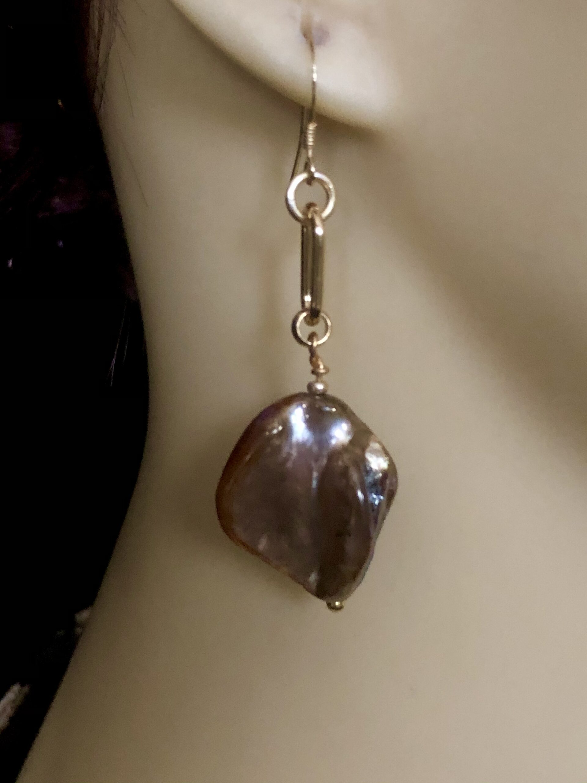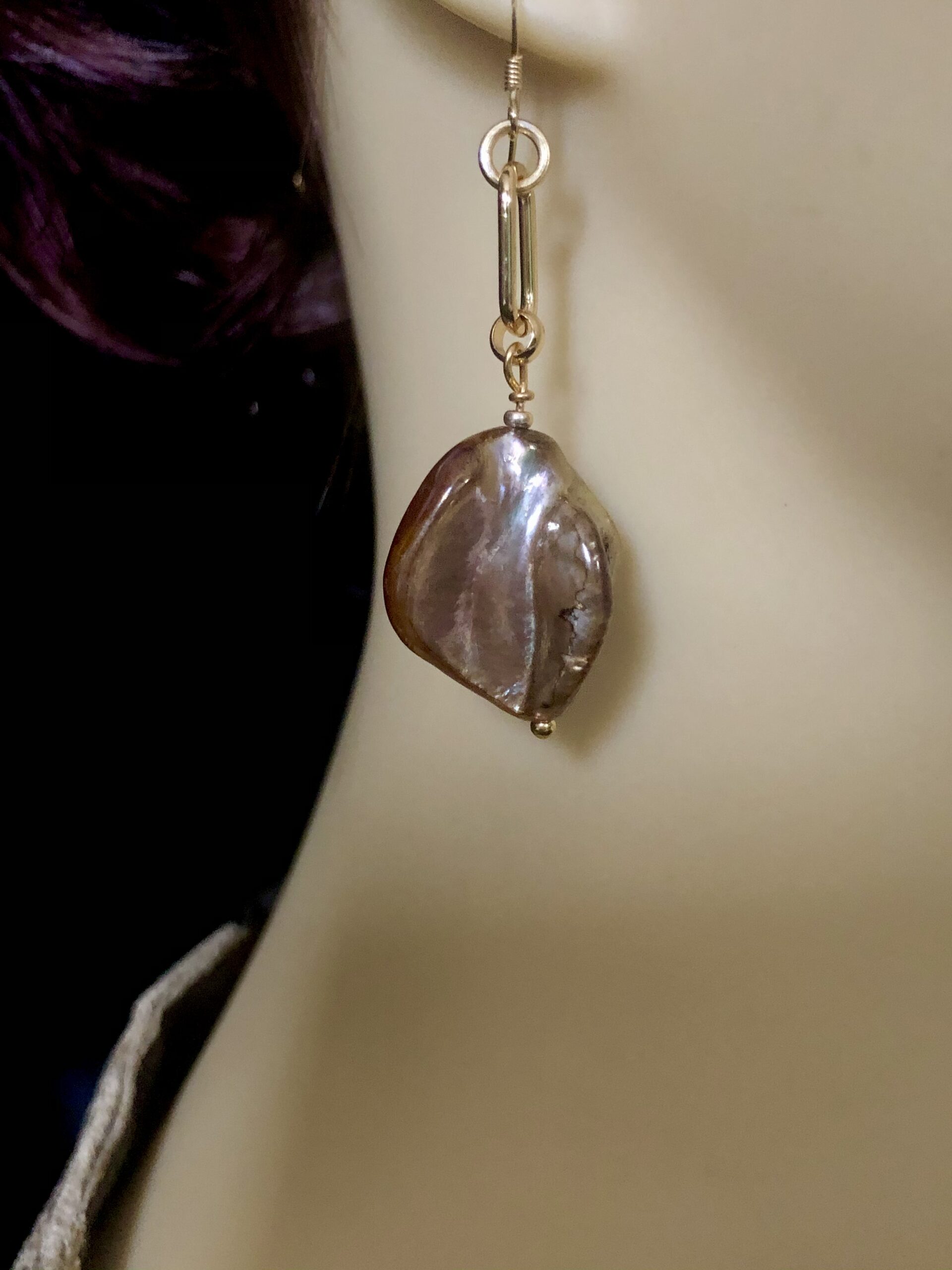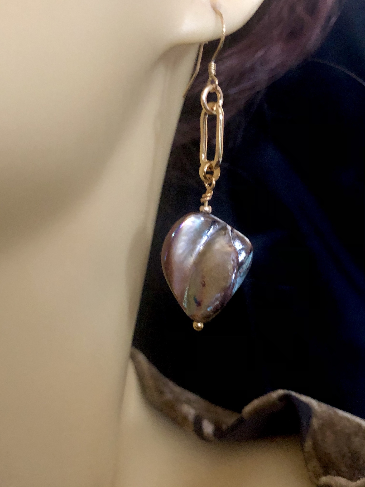 Mother of Pearl is the pure nacre from the inside of a mollusk shell and, as its name implies, is the material which clings to an irritant in the shell to form a pearl. Isn’t nature clever! These earrings have a wonderful golden lustre with purple hues and are set onto a gold tone chain link and gold-plated sterling silver shepherd hooks. They are substantial in look but light to wear.