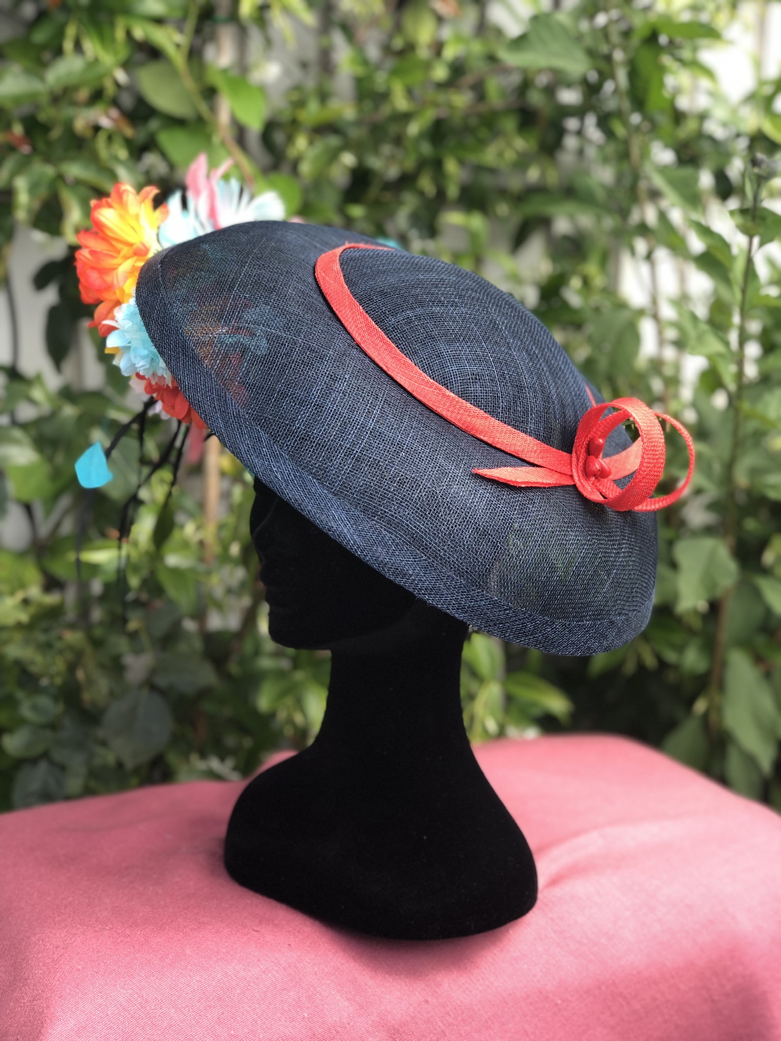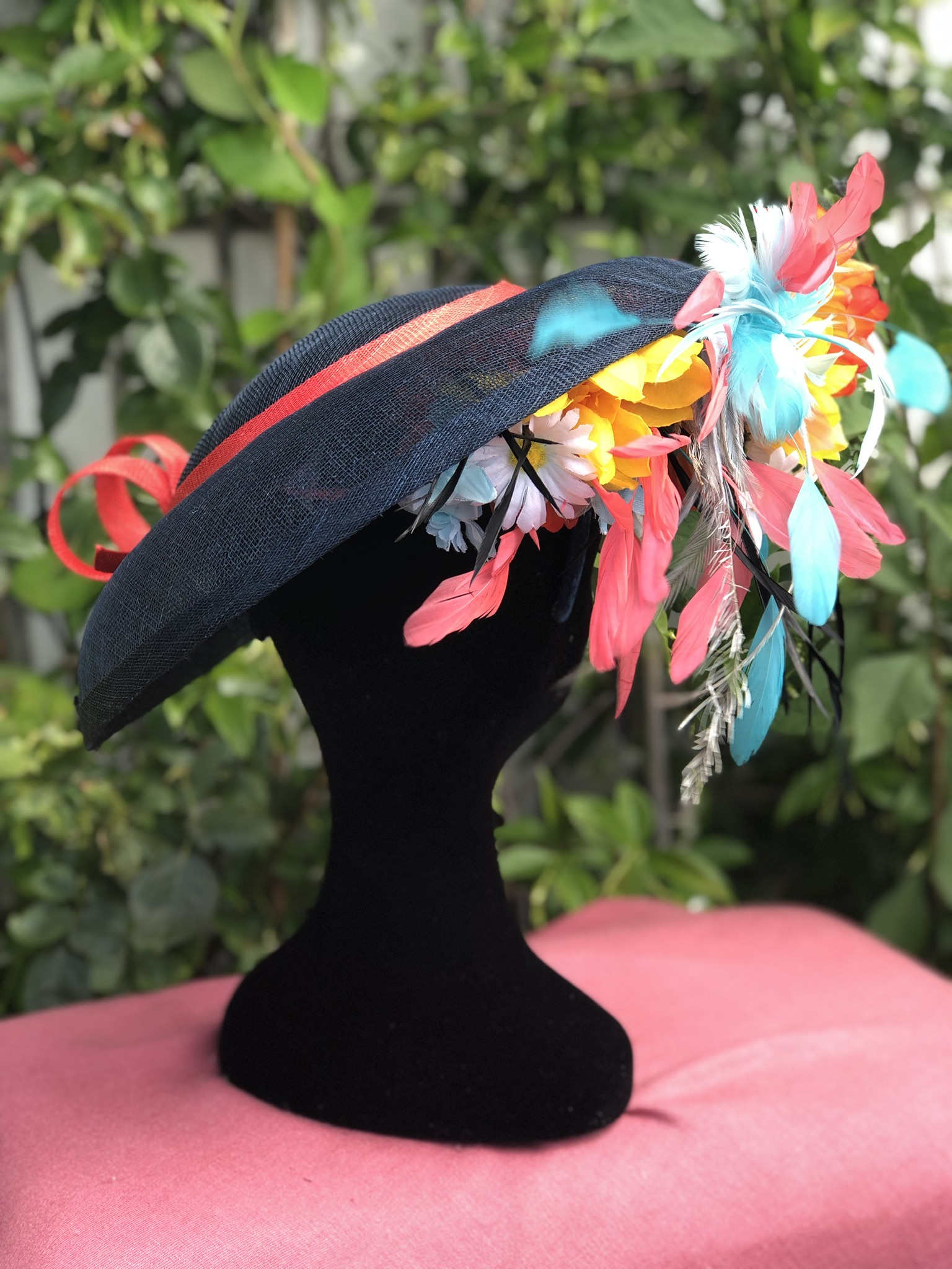 Bright, multi colour fascinator hat mounted onto headband and adorned with feathers and fabric flowers.Coco Chanel inspired wide brimmed hat mounted onto head band.