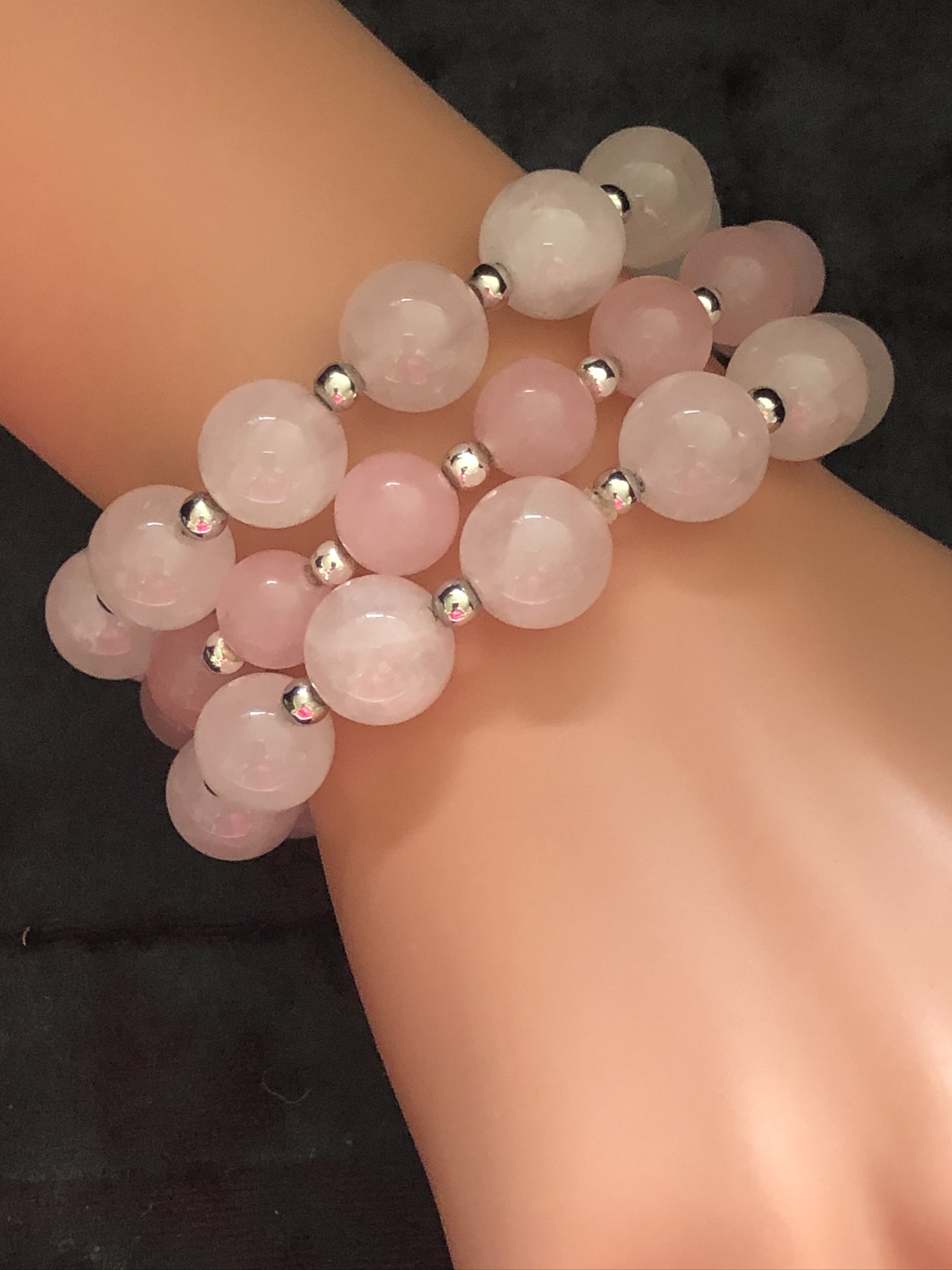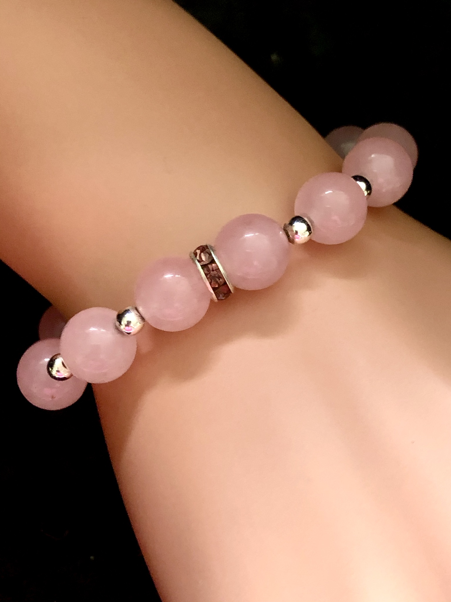 10 mm rounds of pale pink Quartz with silver spacer beads and pink garnet colour sparkly spacer bead.