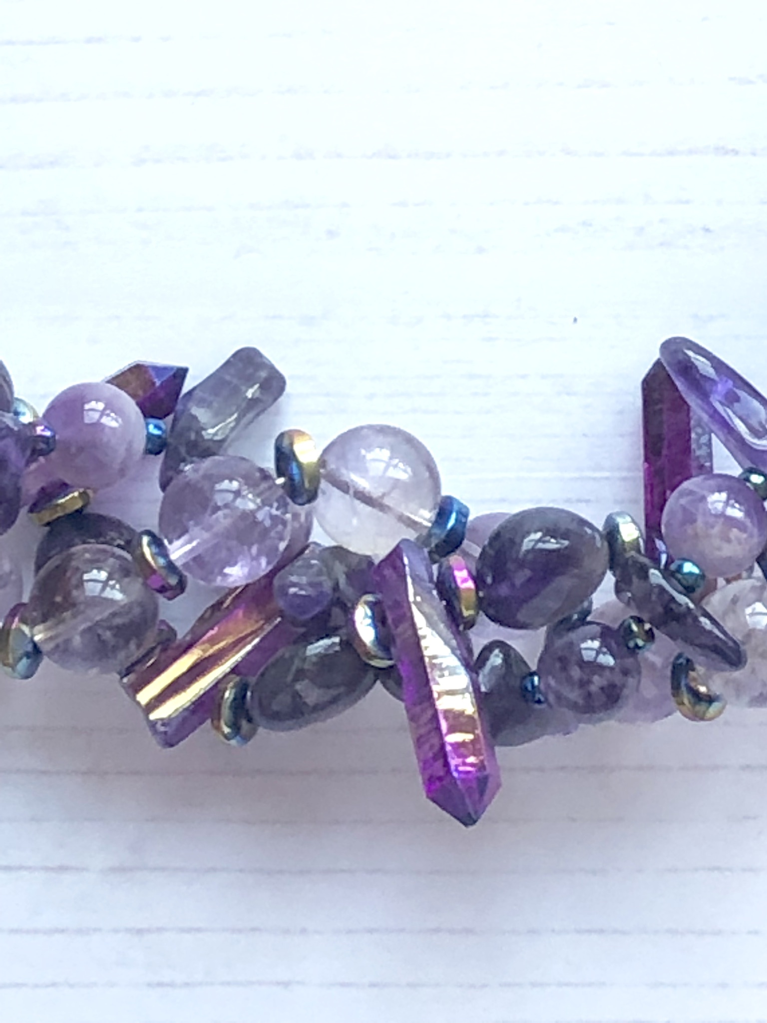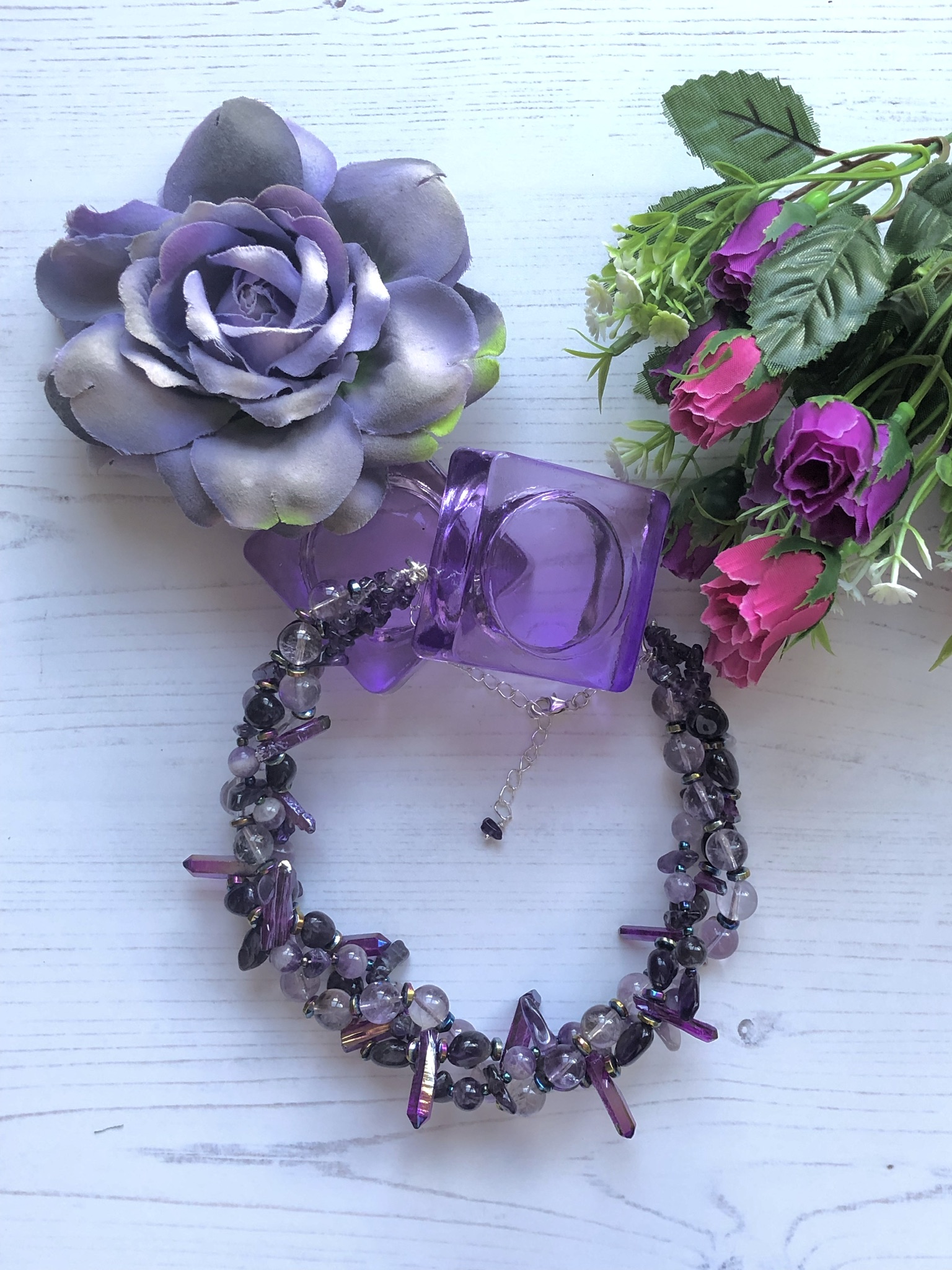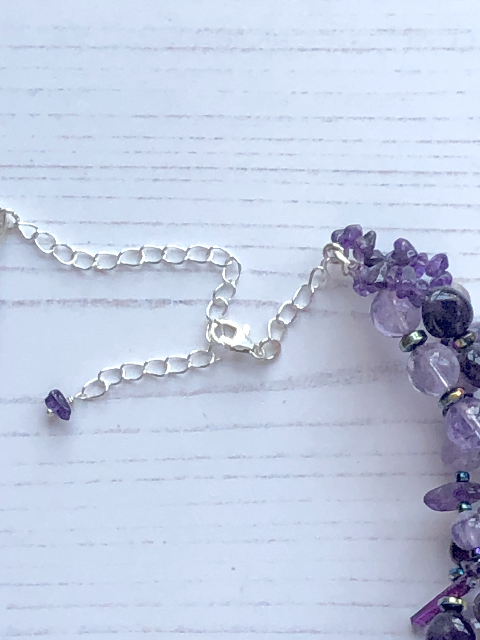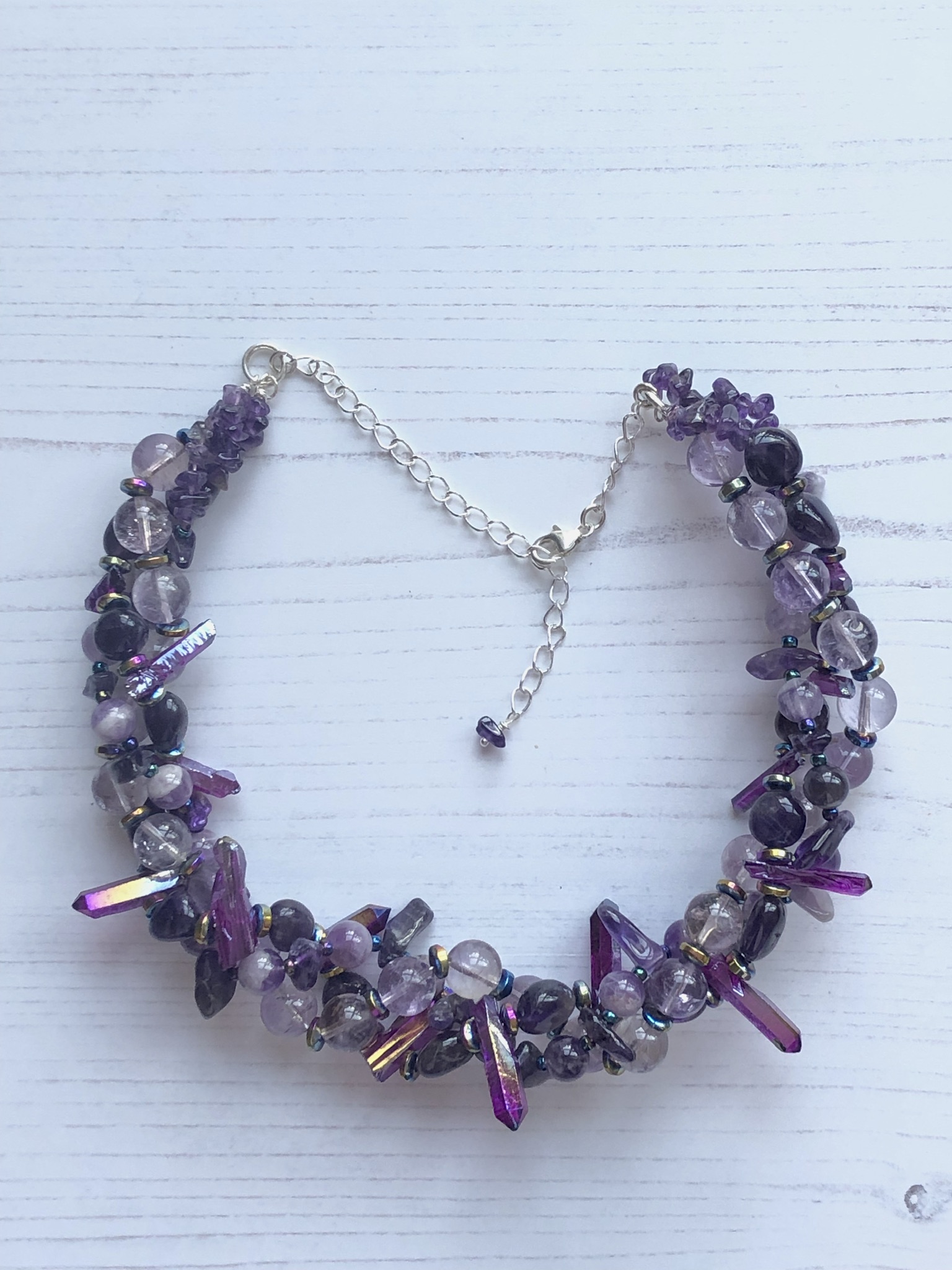Add a touch of regality to your outfit with this Amethyst twisted necklace comprising a mix of clear Amethyst beads, rich dark purple tumbles, dog tooth rounds and purple coated Quartz shards. Sterling silver lobster claw clasp and extender chain.