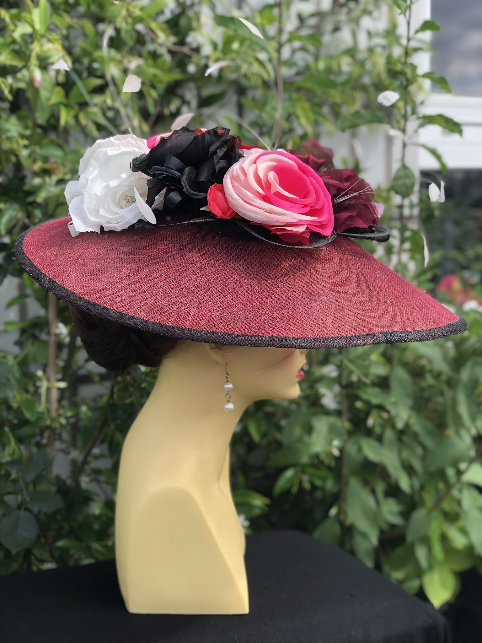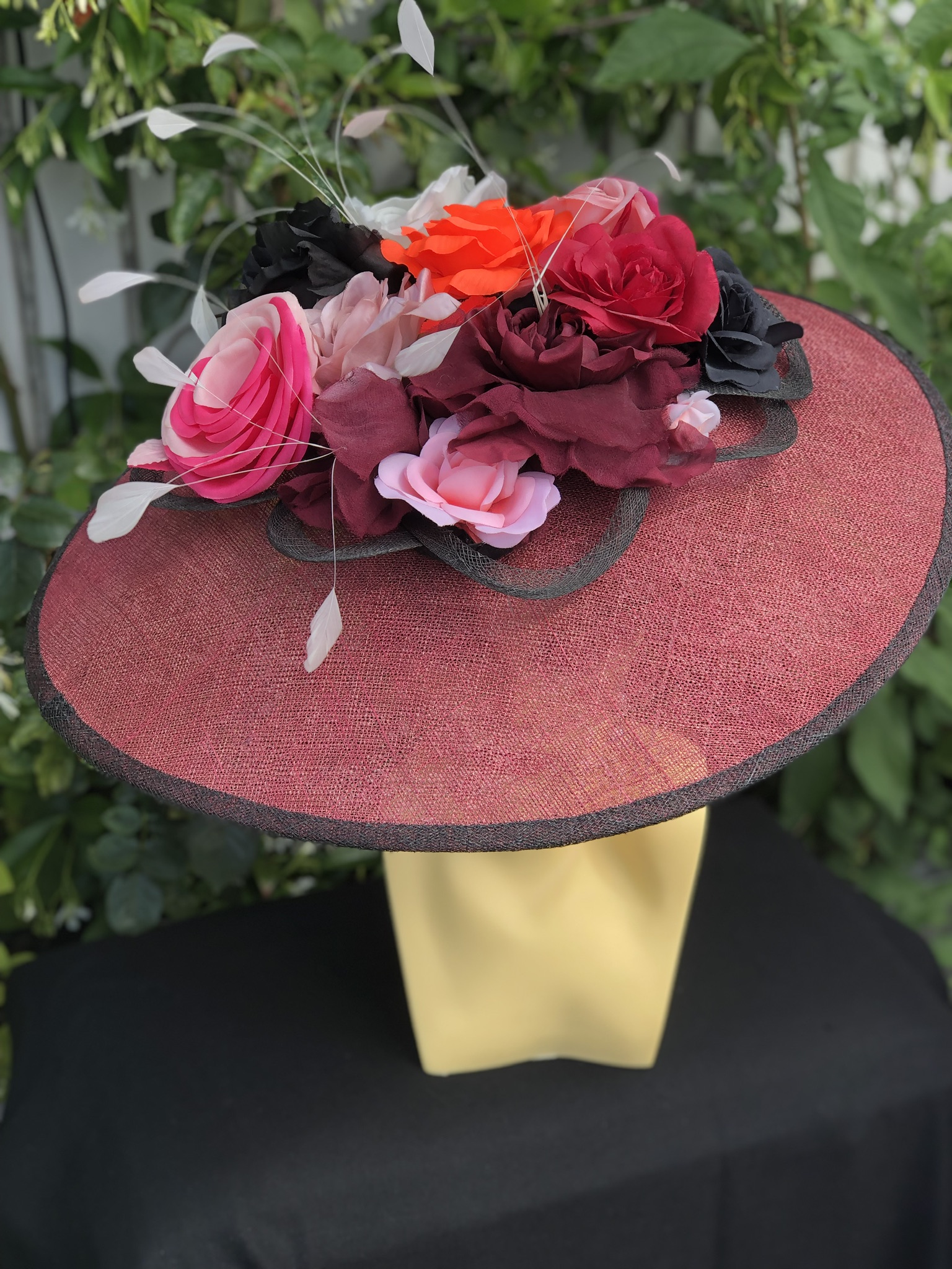 Head band mounted large embellished Fascinator. Sinamay crown embellished with a bunch of summer colour silk roses and white feathers. Under-brim has matching flowers.