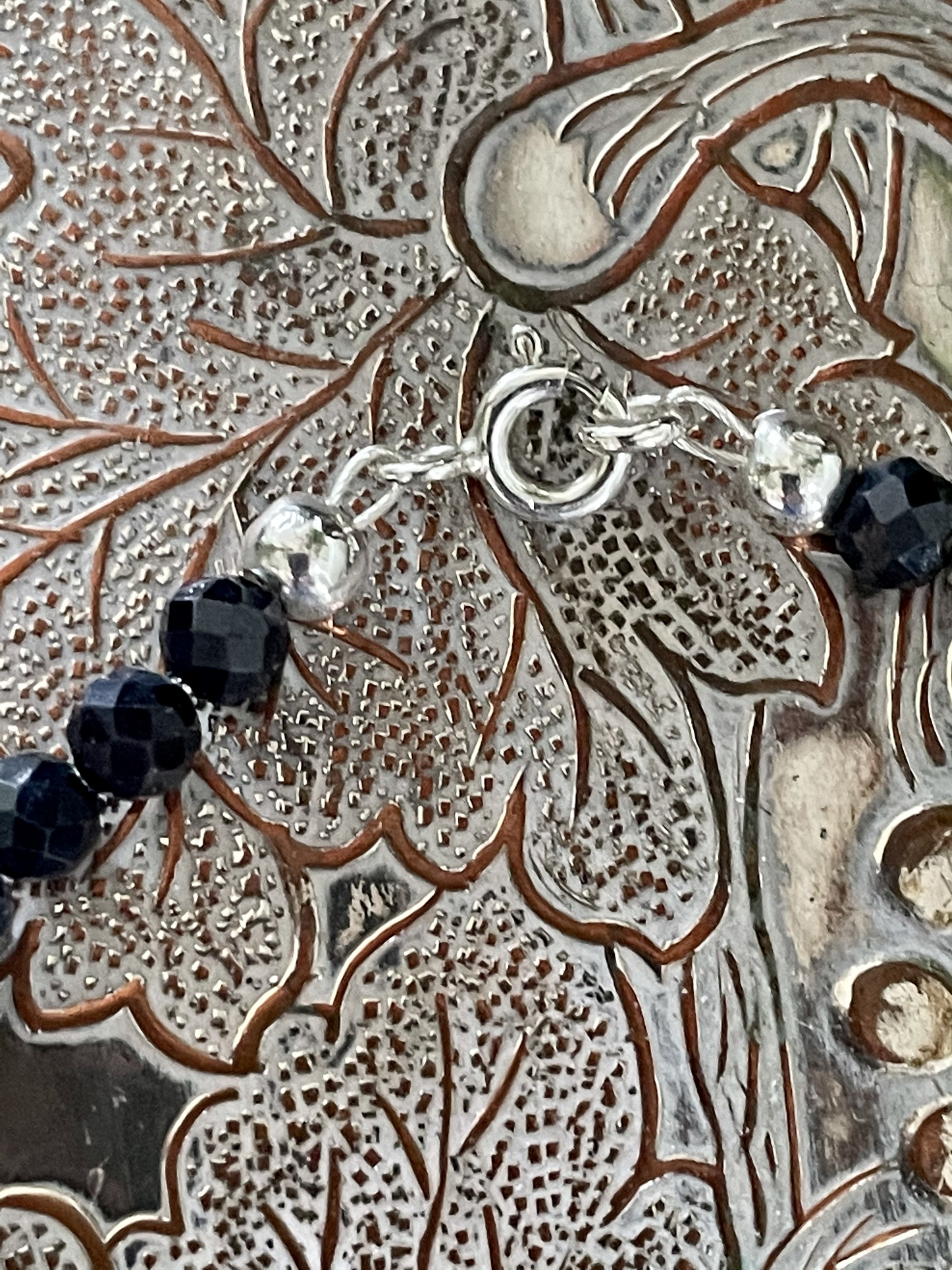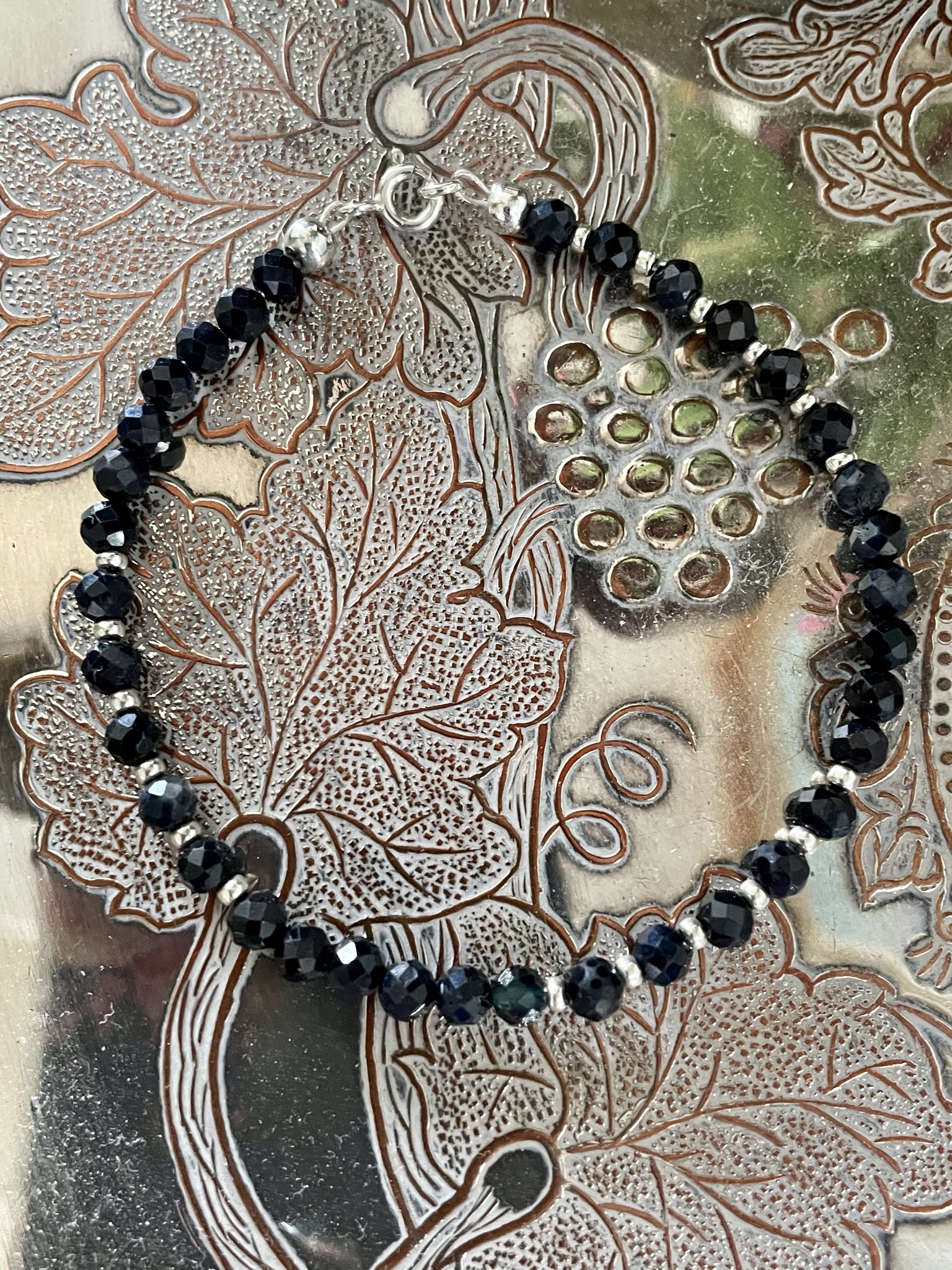 Sparkly 4mm Chinese natural Sapphire faceted gemstones interspersed with silver colour spacer beads and attached with a 925 silver bolt ring clasp. Perfect and elegant on its own and fabulous when stacked up with lots of other bracelets.