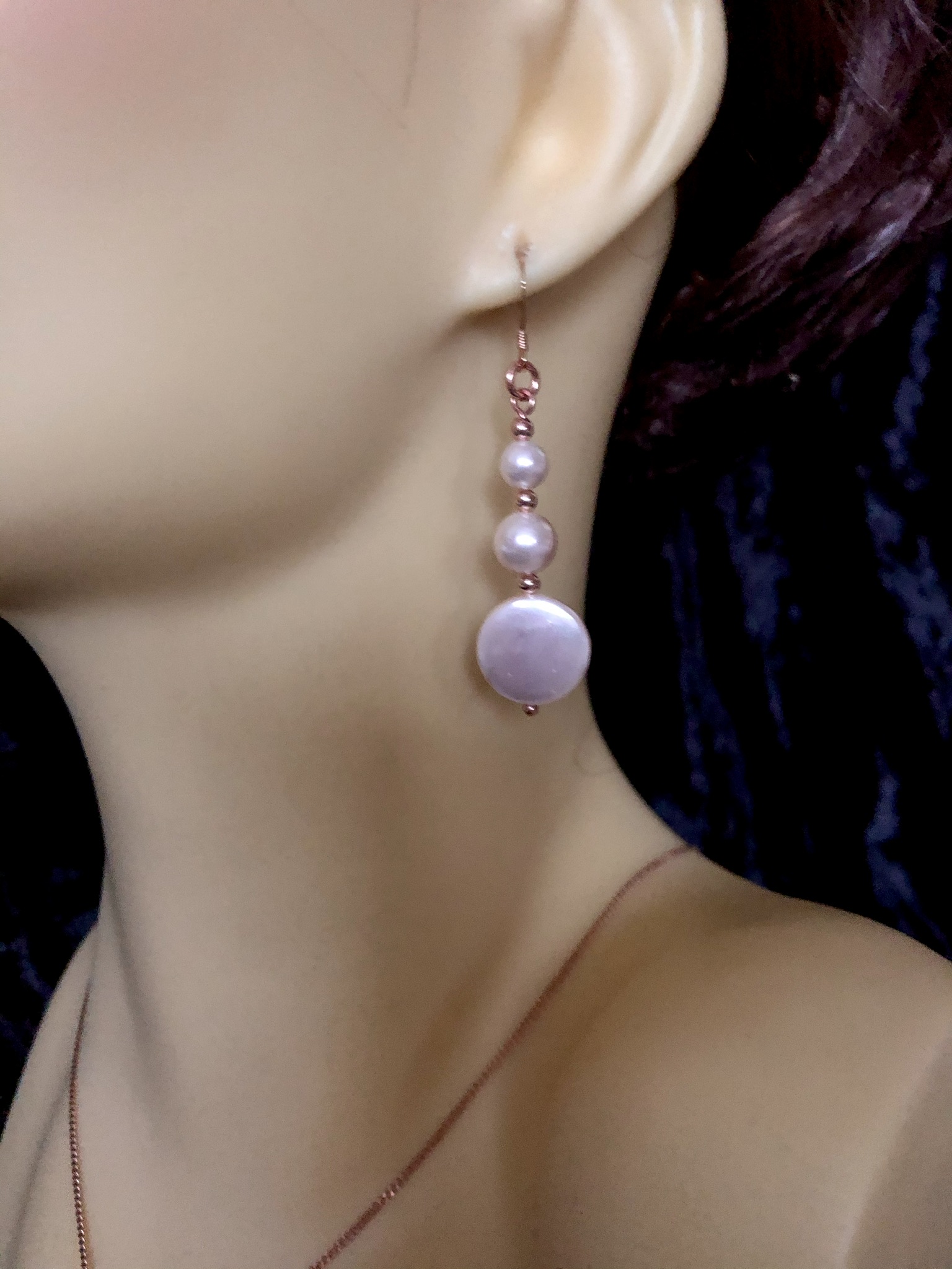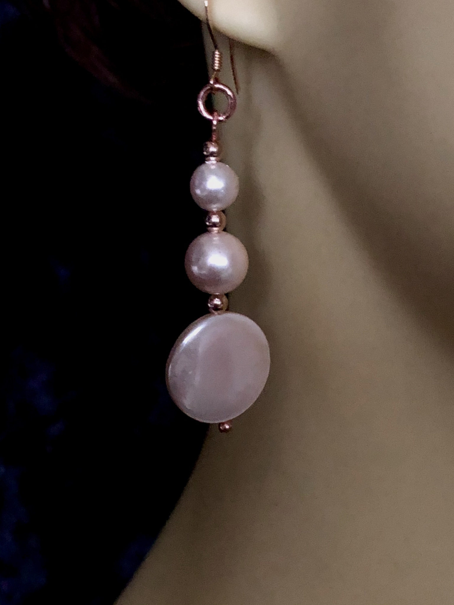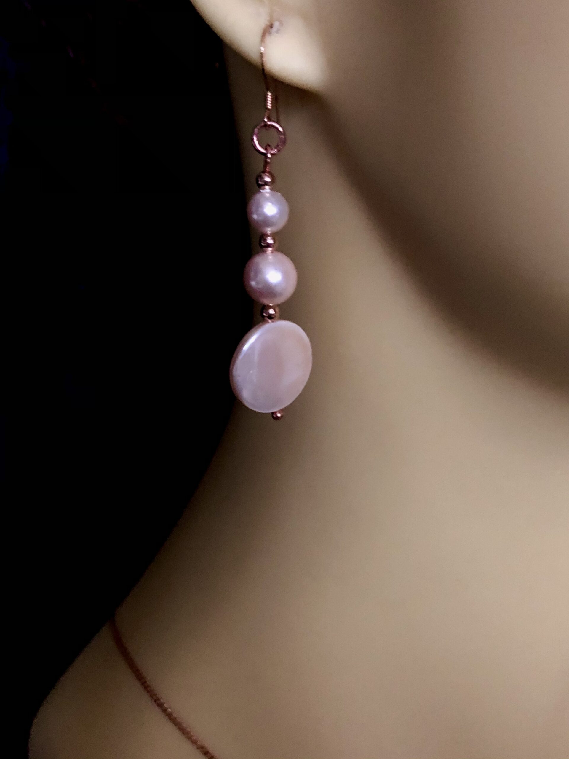 Shell pearls are a high quality alternative to freshwater pearls but at a more affordable price.  These ballet shoe pink pearls have been set into rose gold plated shepherd’s hooks with matching spacer beads and will glow softly against any skin tone.  Why not wear them with the matching pendant?  Dress them up, dress them down – enjoy!