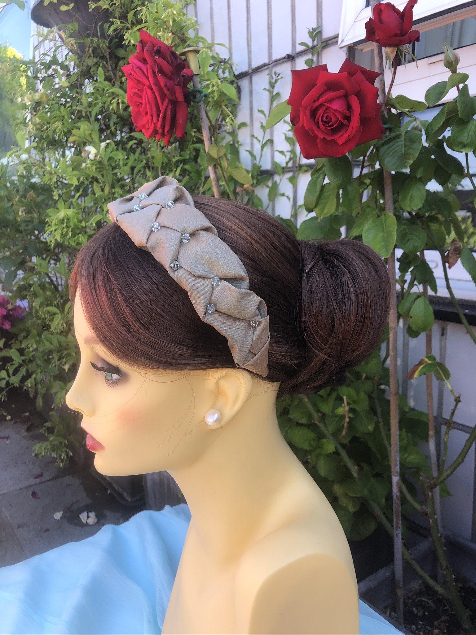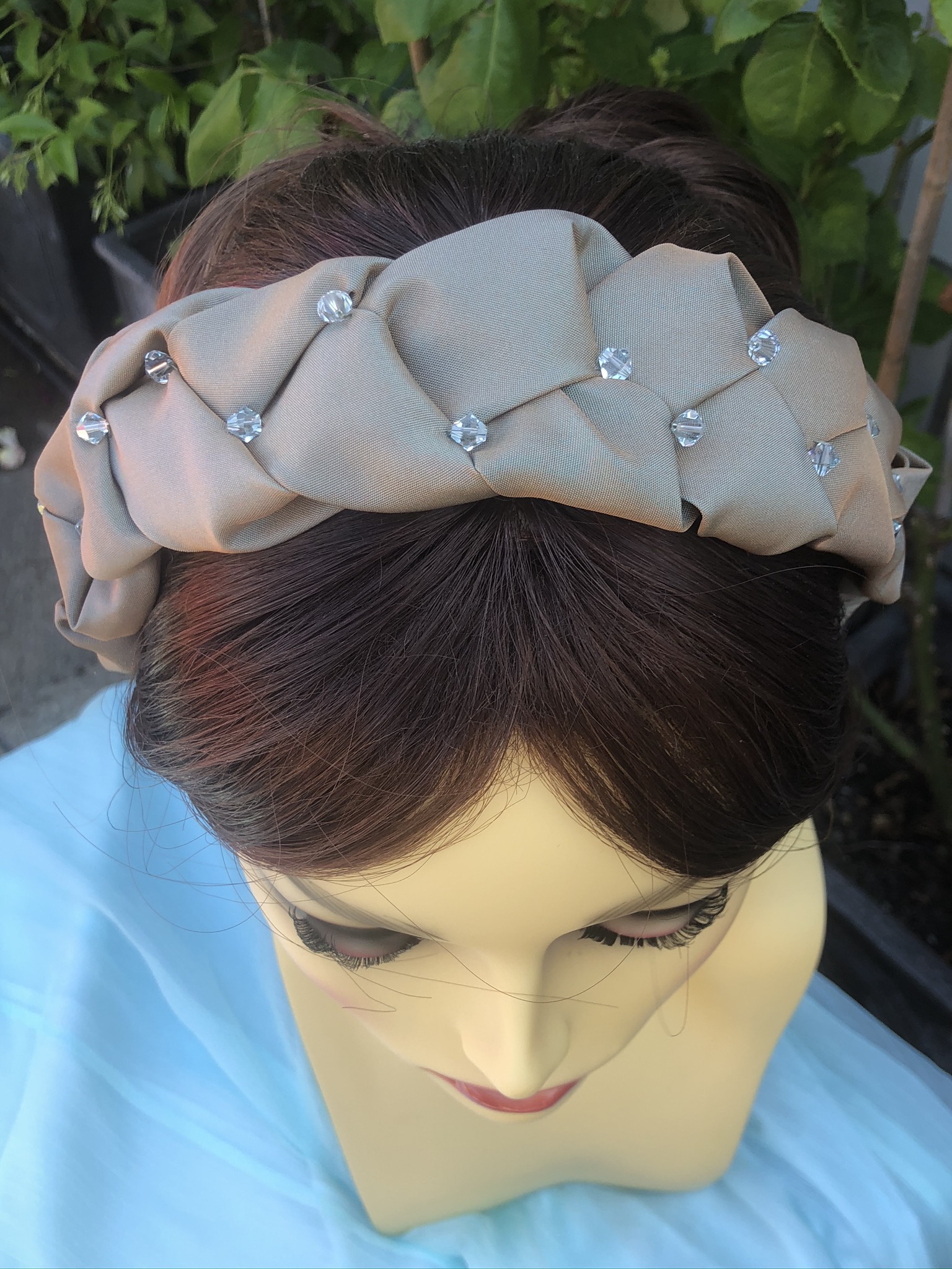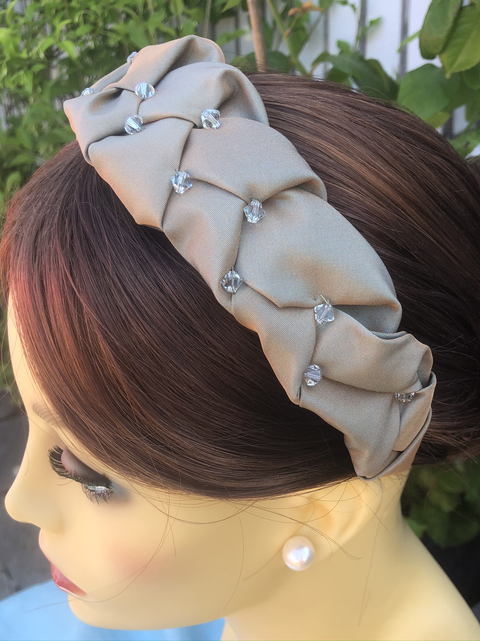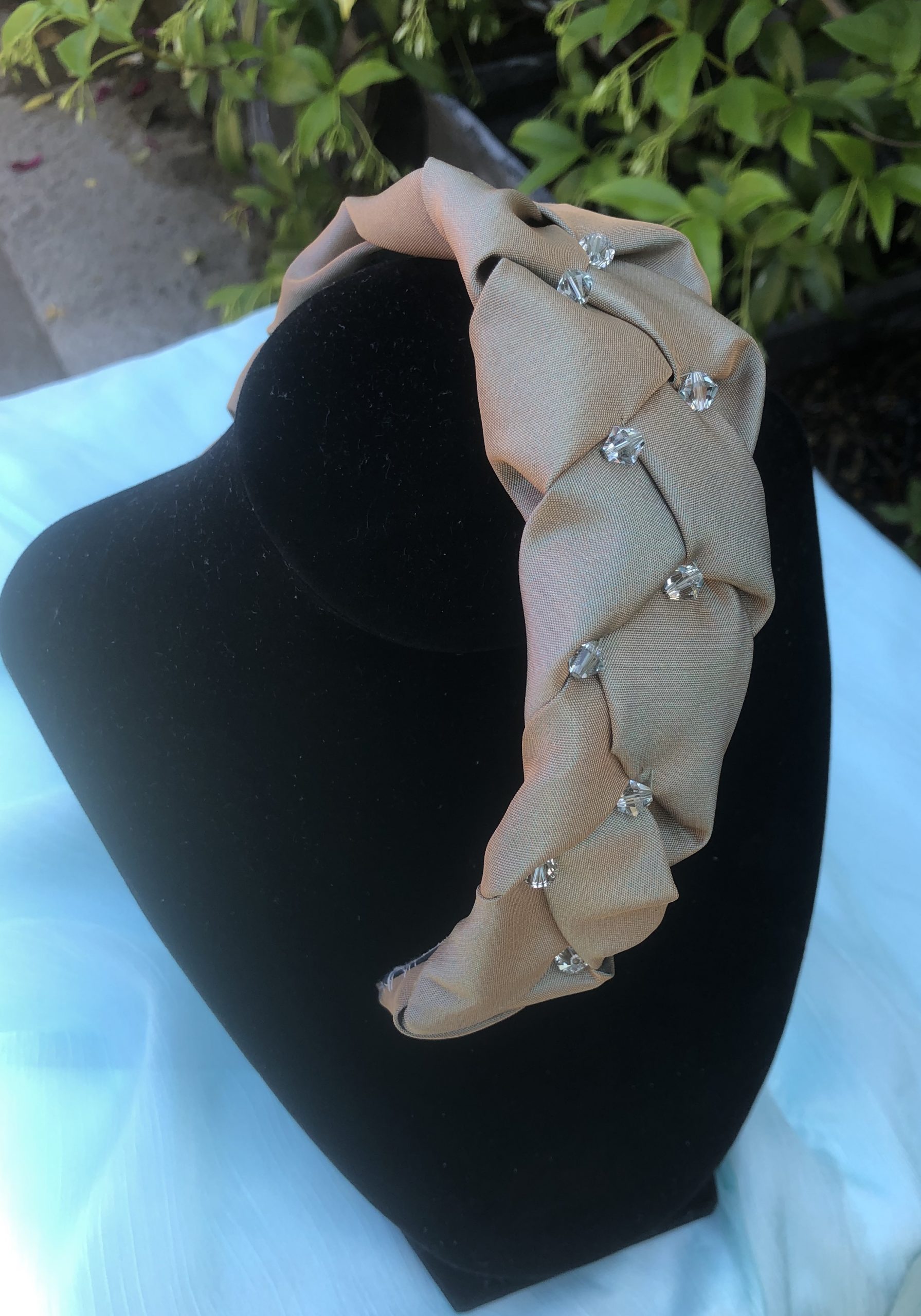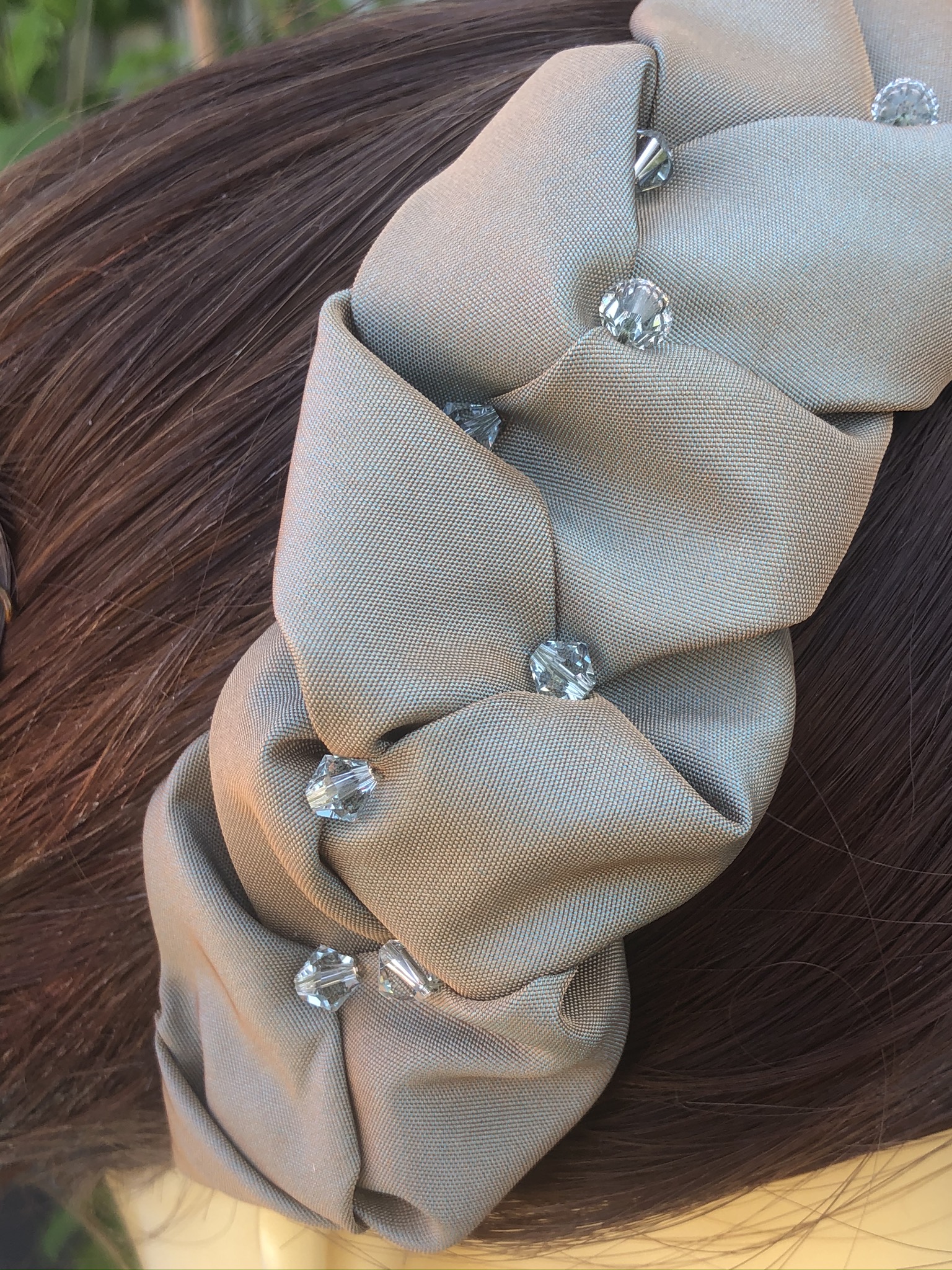 A dressy headband with a bit of subtle sparkle made from plaited taffeta and stitched-in Swarovski bicones.