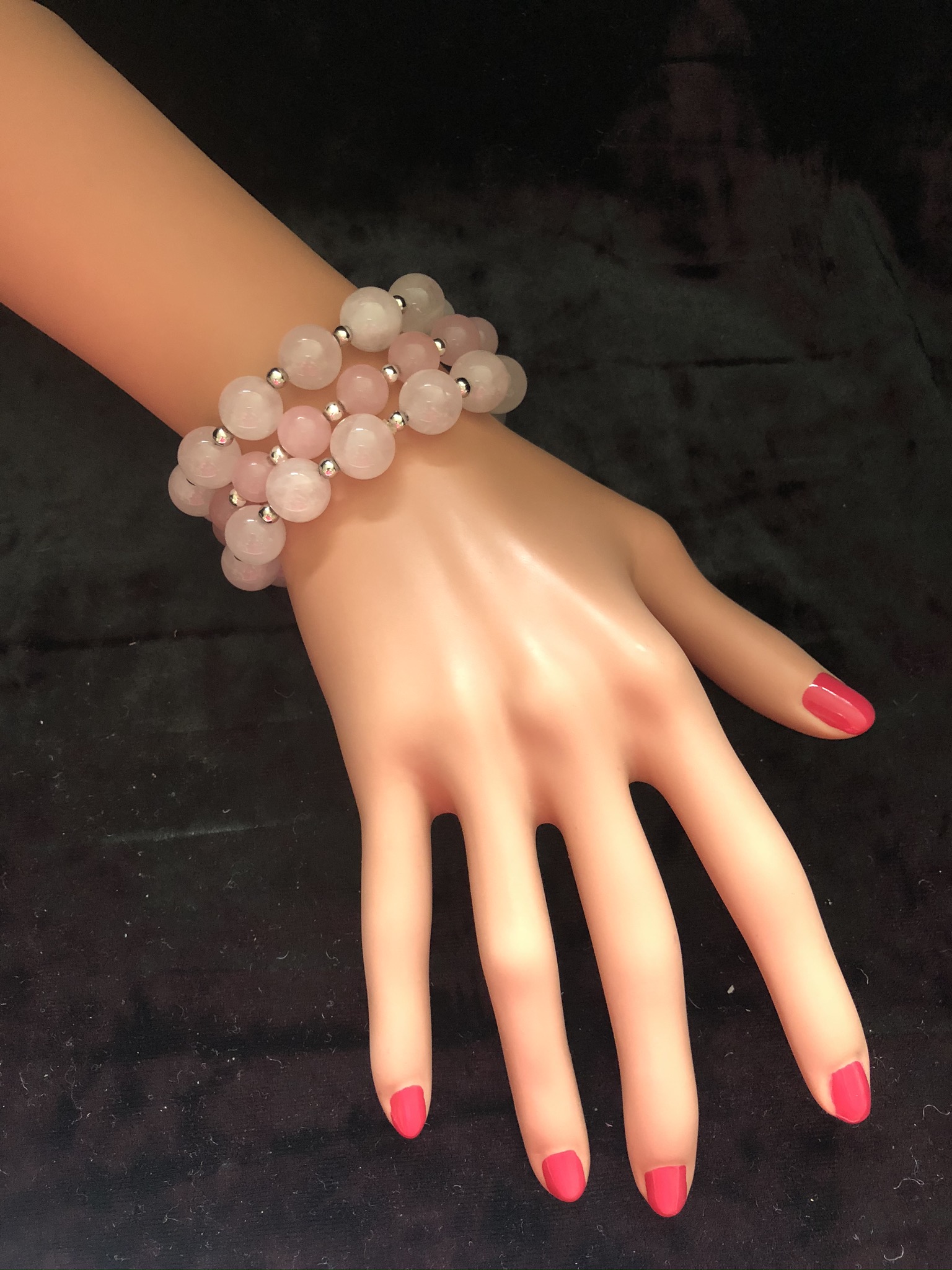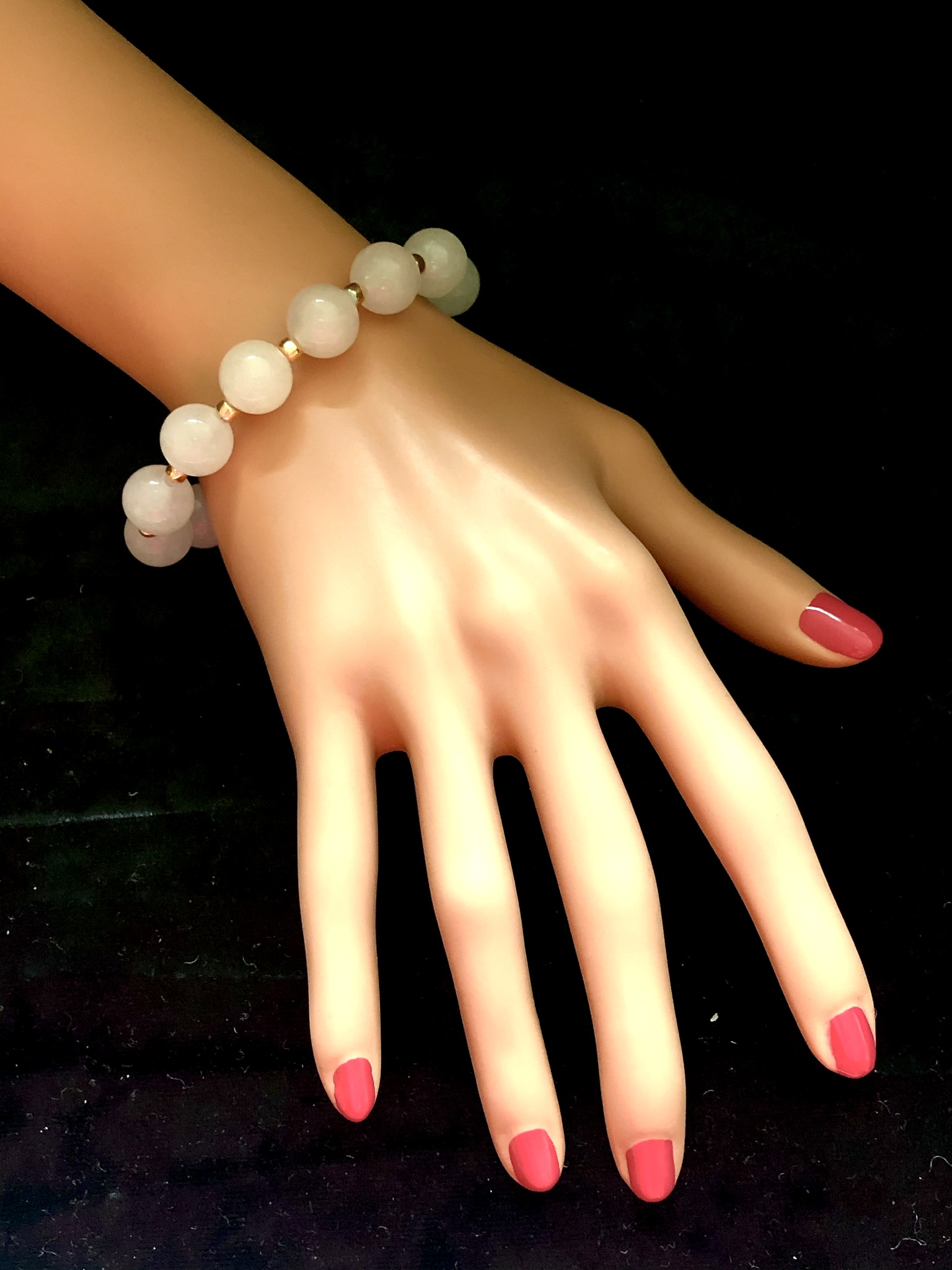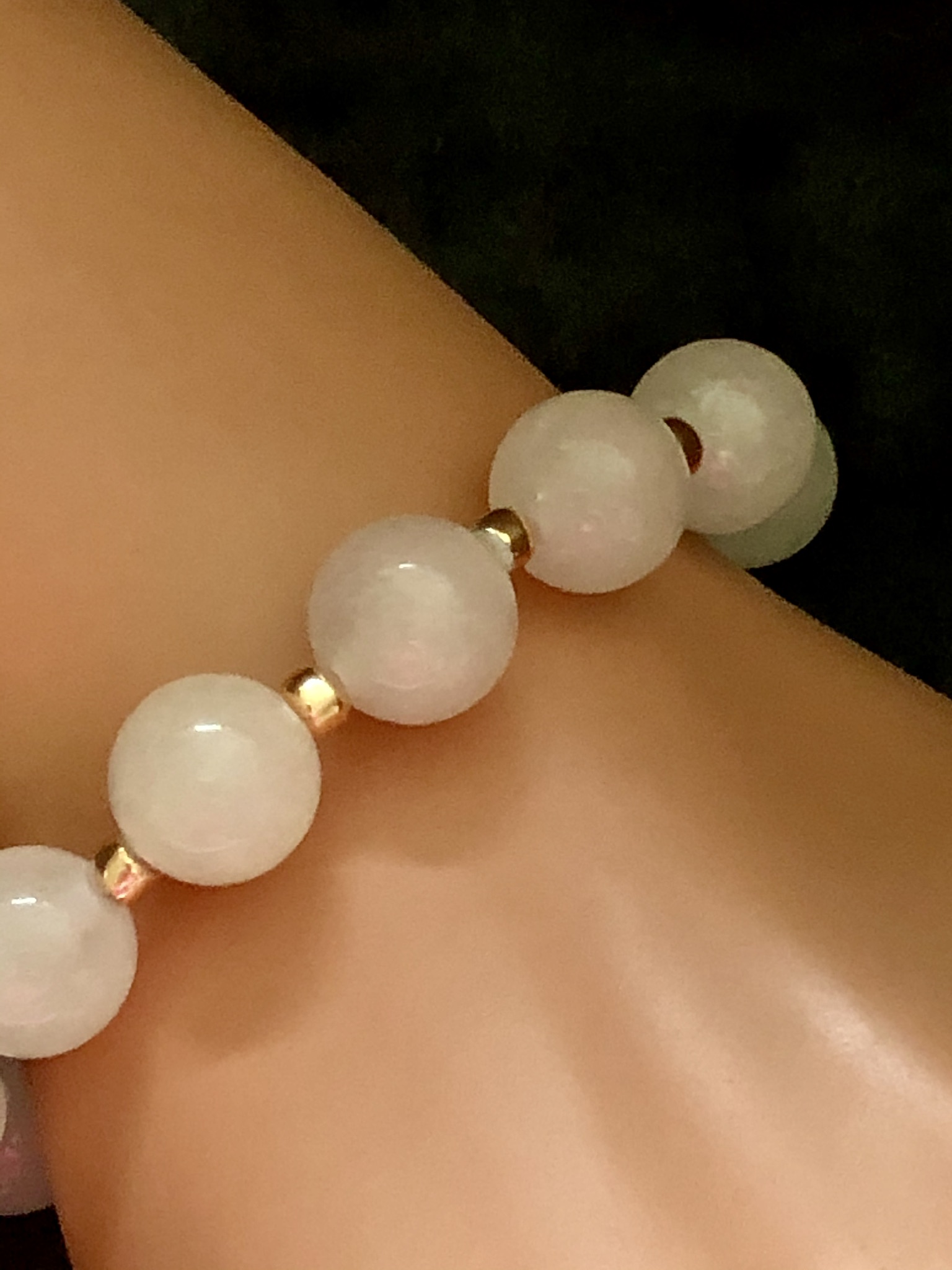 12mm rounds of light, white and shiny quartz with gold tone spacer beads.