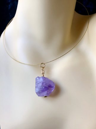 Rough Cut Amethyst Pendant Gold Tone Memory Wire Necklace